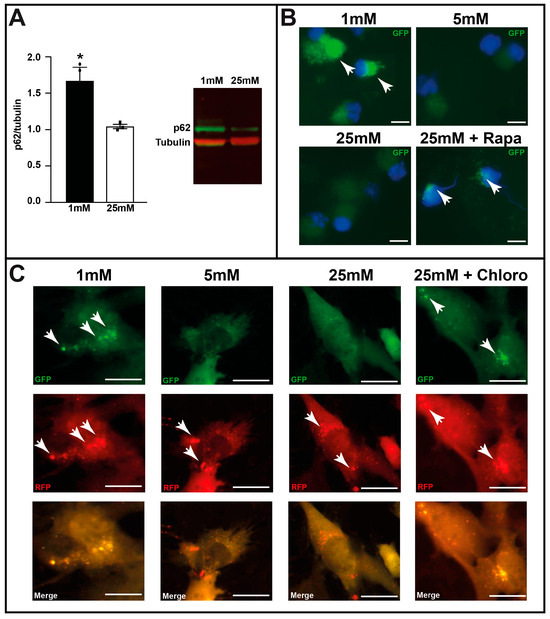 Low-glucose conditions induce autophagosome formation in isolated retinal ganglion cells (RGCs). (A) p62/SQSTM1 protein expression in isolated C57BL/6 RGCs cultured with 1 and 25 mM glucose for 48 h, assessed by Western Blot analysis. Results are expressed as mean ± SEM of 3 experiments. * p < 0.03. (B) GFP fluorescence (white arrows) of isolated GFP-LC3tg/+ RGCs cultured at various glucose concentrations (1, 5, and 25 mM); rapamycin (Rapa), an autophagic activator, was used as control. (C) GFP and RFP fluorescence (white arrows) of isolated C57BL/6 RGCs infected with mRFP-GFP-LC3 lentivirus and cultured at various glucose concentrations (1, 5, and 25 mM); chloroquine (Chloro), an inhibitor of autophagosome/lysosome fusion, was used as control. The images are representative of three different experiments. Scale bar 200 mm.