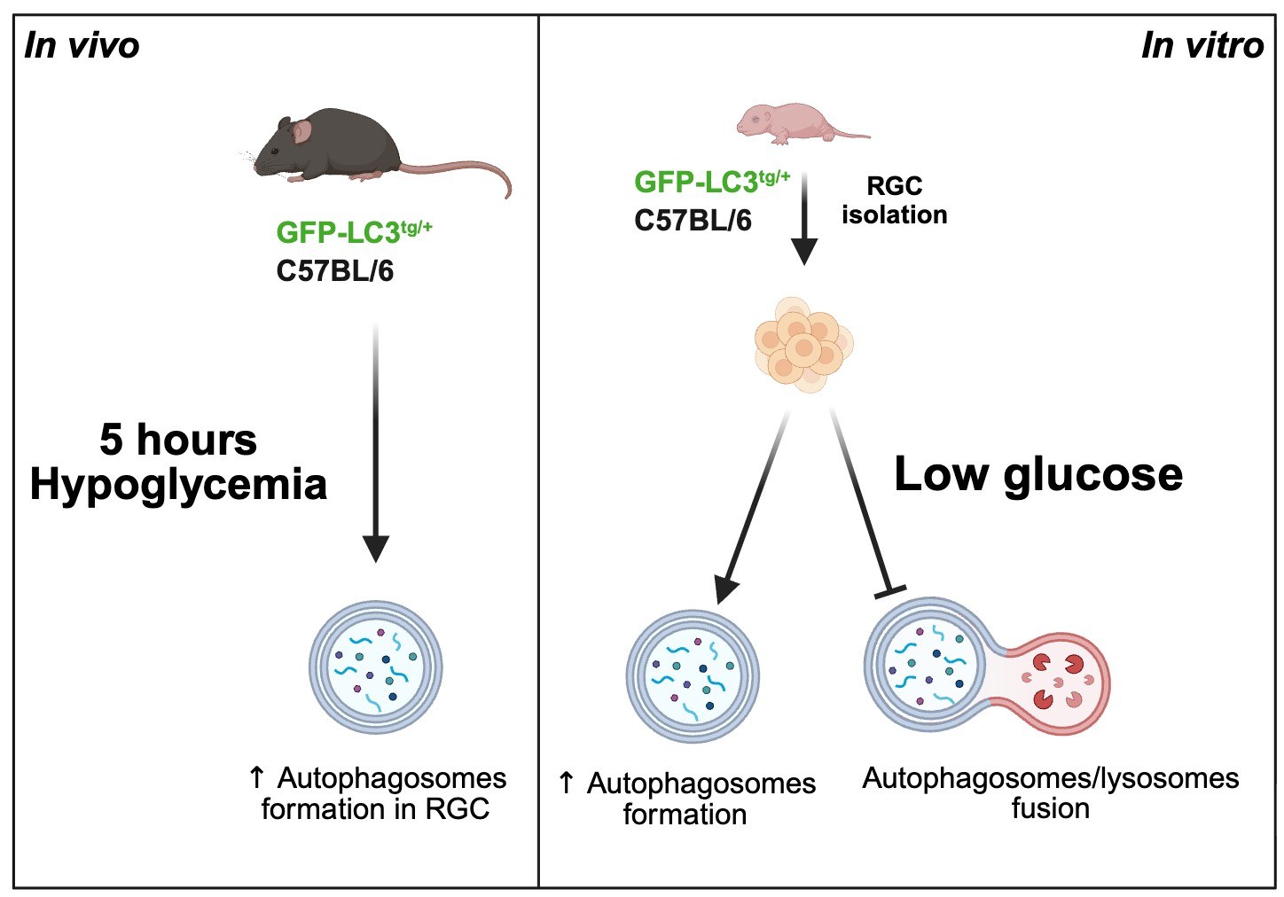 - The formation of autolysosomes is increased by hypoglycemia both in living tissue and in retinal ganglion cells (RGCs).