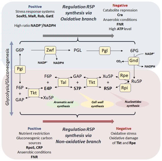 This review is devoted to a comparative analysis of the features of R5P biosynthesis among different domains of microorganisms. The main regulatory mechanisms coordinating the work of the canonical PPP on the example of bacteria are considered in the context of two alternative pathways for the synthesis of pentose phosphates, catabolic (oxidative branch) and anabolic (reversed non-oxidative branch) (Figure 1). Using the example of various genetic modifications of PPP, we highlight an unexpected physiological feature of the anabolic synthesis of R5P as a stress resistance factor.