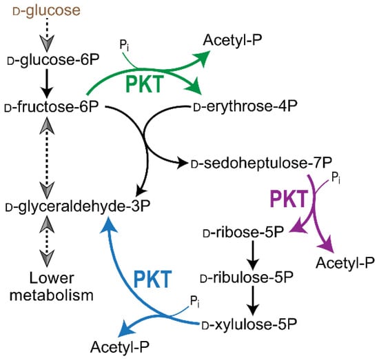 The main function of the pentose phosphate pathway—the production of essential sugar phosphates, in particular R5P—can be replaced by the triple activity of only one universal enzyme, phosphoketolase PKT from Bifidobacterium adolescentis (Figure 3) []. Overexpression of PKT in E. coli cells with completely inactivated PPP via the zwf and tktAB genes deletions leads to prototrophic growth, catalyzing three sequential mechanisms: the distribution of Xu5P, F6P and, in particular, S7P. The presented studies are definitely interesting from the point of view of evolutionary biology and biochemistry and can find application in biotechnology. However, PPP in its current form with a given set of enzymes is optimal in an evolutionary sense, providing flexibility to the process of R5P synthesis in accordance with the anabolic status of the cell.