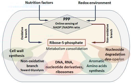 The canonical PPP is essentially an anabolic sensor designed to coordinate the level of pentose phosphates required for the maintenance of the cellular biosynthetic apparatus and genome replication with the generation of reducing equivalents of NADPH involved in the synthesis of amino acids, lipids and other metabolites during cell growth and division, depending on environmental conditions and nutrient availability. This position in central metabolism implies complex dynamic regulation through hierarchical interactions between the transcriptome, proteome and metabolome.
