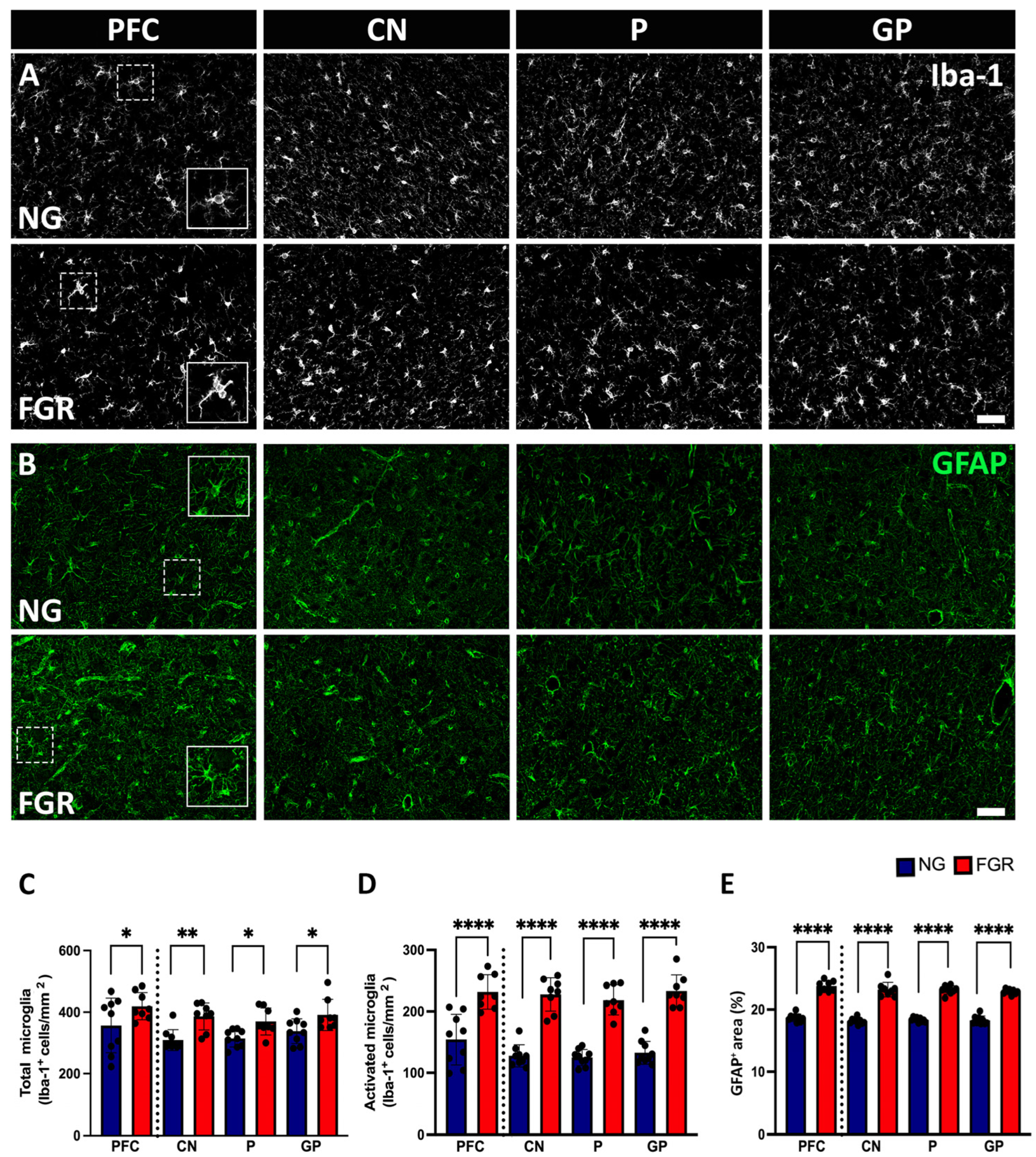 3.3. Increased Activation of Glial Cells in the Grey Matter of FGR Brains