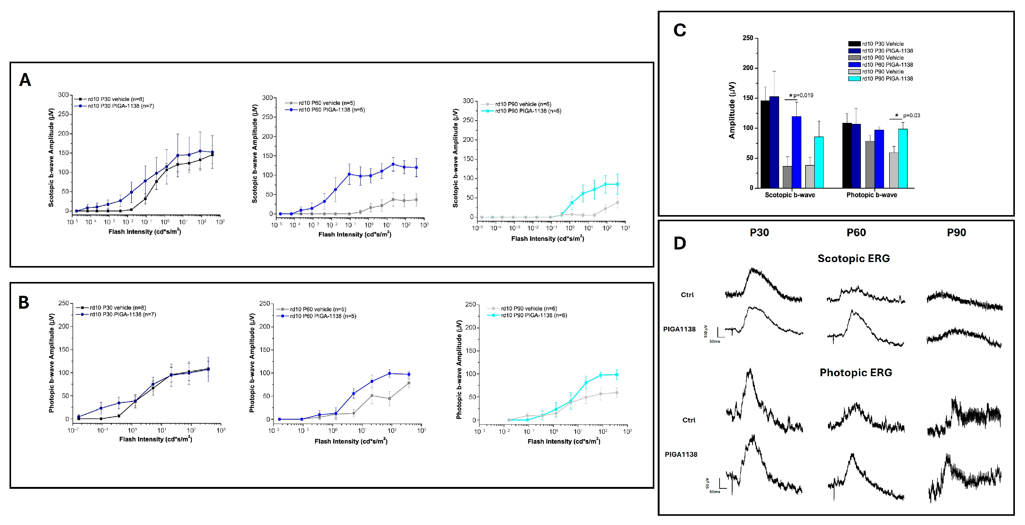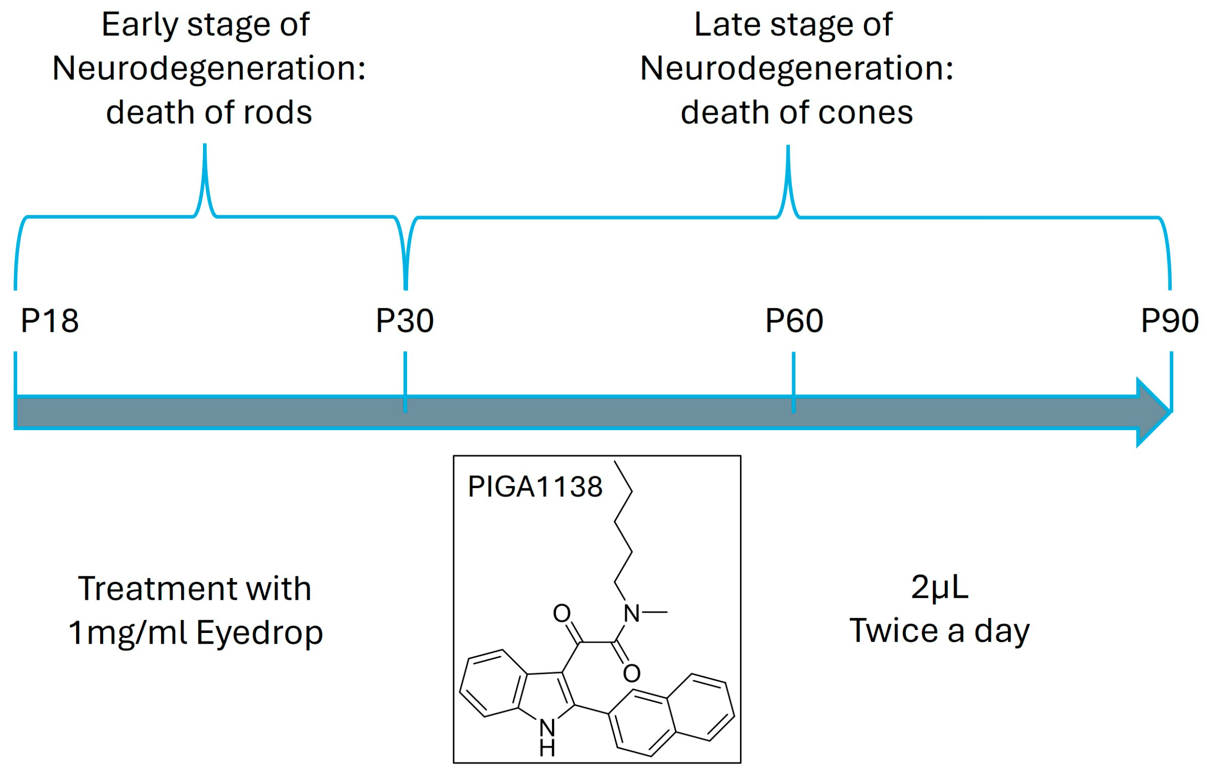 The animals, totaling 62 and of both sexes, were previously divided into two groups: a control group, which received the formulation without PIGA1138, and a treated group, which received the formulation containing PIGA1138 at a concentration of 1 mg/mL. Treatment began at P18, coinciding with the onset of rod degeneration, and continued at three different time points: P30 (ctrl n = 11, PIGA1138 n = 10), P60 (ctrl n = 10, PIGA1138 n = 10), and P90 (ctrl n = 10, PIGA1138 n = 11).