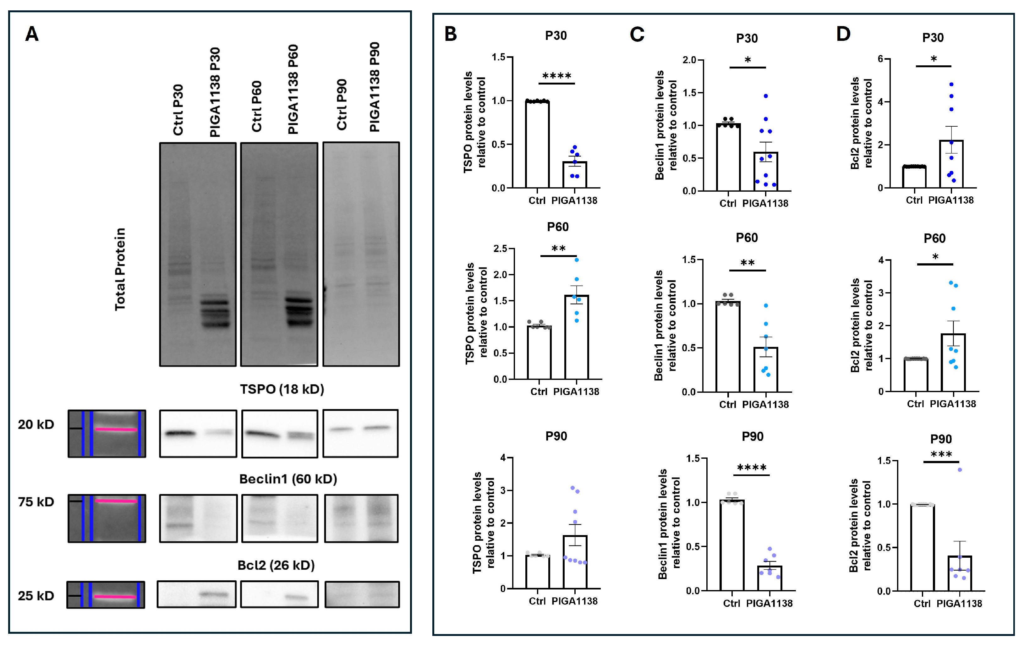 Behavioral testing using the Prusky water maze demonstrated that photopic visual acuity was significantly preserved in PIGA1138-treated mice across all three evaluated time points. At P30, an early stage of degeneration, treated animals exhibited near-physiological levels of visual acuity, indicating substantial protection of the initial retinal structures affected. Although some functional decline was noted at P60, mice still outperformed controls, whose visual performance was already severely compromised. By P90—when degeneration is typically near complete in rd10 mice—treated animals retained a residual visual response, suggesting that PIGA1138 significantly delayed disease progression. Electroretinogram (ERG) recordings corroborated these behavioral results. Analysis of the b-wave revealed enhanced retinal responses in treated mice, particularly in the earlier stages of degeneration. At P30, higher scotopic and photopic b-wave amplitudes were observed in treated animals in response to the highest light intensity (377 cd∗s/m2), indicating better bipolar cell function and, by extension, healthier photoreceptor populations. At P60, although b-wave amplitudes decreased in both groups, they remained significantly higher in the treated group. At P90, while responses were attenuated overall, a residual b-wave persisted in PIGA1138-treated mice, underscoring the compound’s ability to prolong photoreceptor viability beyond the typical degenerative threshold in this model. At the molecular level, Western blot analyses revealed significant differences in the expression of key markers of oxidative stress and microglial activation between treated and untreated groups. Notably, TSPO levels were significantly elevated in the treated animals at P60 and P90—later stages of degeneration—highlighting its relevance as both a therapeutic target and a potential biomarker for reactive gliosis in retinal neurodegenerative conditions. Moreover, treated animals showed a marked increase in the expression of Bcl-2, a well-established anti-apoptotic protein. Upon dissociation from its binding partner Beclin-1, Bcl-2 inhibits photoreceptor apoptosis triggered by inflammatory stress and simultaneously promotes autophagy. Interestingly, across all three time points, Beclin-1 expression tended to decrease significantly in treated animals—likely due to intracellular degradation following its release from the Bcl-2/Beclin-1 complex. This reduction, when coupled with Bcl-2 upregulation, may reflect a shift toward a protective, physiologically regulated autophagic process that aids in retinal repair and survival.