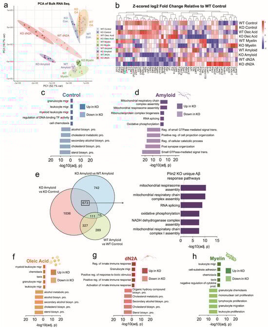 Plin2 deletion reprograms microglial transcriptomes across stimuli. (a) Principal component analysis (PCA) of bulk RNA-seq from WT and Plin2 KO BV2 cells under control, amyloid beta (Aβ), oleic acid (OA), dN2A, and myelin treatments. (b) Heat map of microglial genes and representative differentially expressed genes (DEGs), shown as Z-scored log2 fold change relative to WT control (scale at right). (c,d,f–h) Pathway enrichment analyses for DEGs in Control (c), Aβ (d), OA (f), dN2A (g), and Myelin (h). Bars show the top enriched Gene Ontology terms for genes up in KO (right bars) and down in KO (left bars), ranked by −log10(adjusted p value). Across conditions, sterol and broader lipid-biosynthetic programs were KO-depleted, whereas innate immune, cytoskeletal, vesicle/lysosome, and—under Aβ—mitochondrial respiration/respirasome pathways were KO-enriched. (e) Venn diagram of DEGs under Aβ exposure across three contrasts: KO Aβ vs. KO Control, WT Aβ vs. WT Control, and KO Aβ vs. WT Aβ. Stats: per-treatment KO vs. WT contrasts with Benjamini–Hochberg false discovery rate (BH FDR) control; primary threshold FDR < 0.05. Functional enrichment used GO over-representation with BH-adjusted p-values (FDR control). Complete gene-level results and enrichment tables are provided in Supplementary Table S1 (“3. Bulk Sequencing DEGs”).