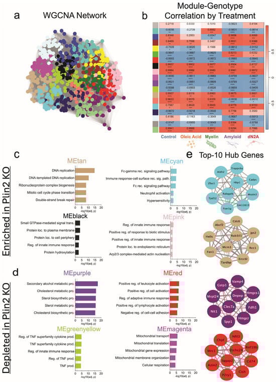 WGCNA of BV2 transcriptomes anchored to Plin2 KO. (a) WGCNA network built from variance-stabilized RNA-seq counts across all samples and treatments; nodes are genes, edges reflect topological overlap, and colors denote data-driven modules. (b) Heat map of module eigengene (ME) correlations with Plin2 KO within each treatment; cells show Pearson’s r with BH-adjusted p-values (red = positive, blue = negative). (c) KO-enriched modules (ME increased in KO); top Gene Ontology terms for representative modules. (d) KO-depleted modules (ME decreased in KO); top Gene Ontology terms for representative modules. (e) Top 10 hub genes for selected modules; networks display the ten genes with the highest intramodular connectivity (kME) per module, with edge thickness reflecting within-module connection strength. Stats: module–trait associations were computed as Pearson’s r between module eigengenes and genotype within each treatment with Benjamini–Hochberg FDR control. Hubs were defined as the top 10 genes by kME per module. Module GO enrichment results are in Supplementary Table S2. For all statistics, * p < 0.05; ** p < 0.01; *** p < 0.001; **** p < 0.0001.