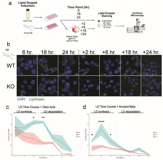 Plin2 loss alters lipid droplet accumulation and dynamics. (a) Experimental workflow. BV2 cells were exposed to oleic acid (OA) or amyloid beta (Aβ), fixed at 6, 18, and 24 h, or switched to serum-free medium for a chase and imaged at the indicated times after removal. Cells were stained with Lipi-Green (neutral lipids) and DAPI (nuclei) and imaged by confocal microscopy. (b) Representative fields for WT and Plin2 KO under Aβ at 6, 18, 24, +2, +6, +18, and +24 h. (c) OA time course. Total lipid droplet area per nucleus over time for WT and KO; WT shows a larger rise by 24 h and partial persistence after serum removal, whereas KO remains lower and trends toward baseline. Shading indicates mean ± SEM. (d) Aβ time course. WT displays an early rise peaking by 18 h and remaining above KO at 24 h; KO shows a minimal increase over the same window. Both genotypes return toward baseline by 48 h. Stats (c,d): two-way ANOVA within treatment (Genotype × Time) with Šídák adjusted post hoc tests; two-sided α = 0.05; data are mean ± SEM with n = 3. Exact adjusted p-values and full model outputs are provided in Supplementary Table S1. For all statistics, * p < 0.05; ** p < 0.01; **** p < 0.0001.