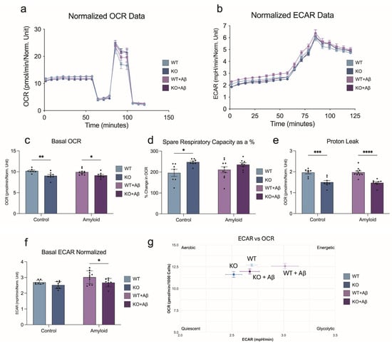 Seahorse XF analyses (OCR/ECAR metrics) were evaluated by two-way ANOVA with factors Genotype and Aβ exposure and Šídák post hoc comparisons; values were normalized to nuclei counts prior to analysis. Well-level source data and summary statistics are provided in Supplementary Table S1 (“Seahorse Stats”).