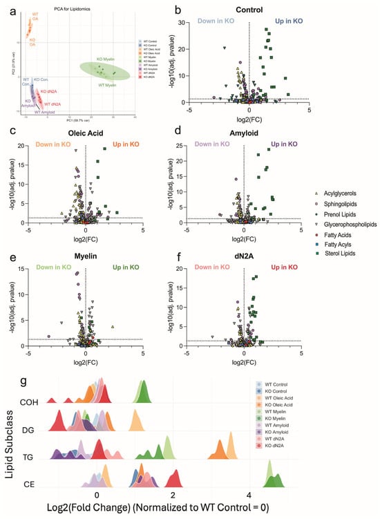 Targeted lipidomics reveals Plin2-dependent routing of neutral lipids. (a) Principal component analysis of lipid profiles from WT and Plin2 KO BV2 cells under control, oleic acid (OA), amyloid beta (Aβ), myelin, and dN2A treatments. (b–f) Volcano plots by condition showing log2 fold change (KO vs. WT) on the x-axis and −log10(adjusted p value) on the y-axis. Each point is a lipid species, with shape indicating lipid class (acylglycerols, sphingolipids, glycerophospholipids, fatty acids, prenol lipids, and sterol lipids). Labels indicate species increased in WT or increased in KO. Across Control, OA, Aβ, and dN2A, KO cells were depleted of triacylglycerols and diacylglycerols and enriched for cholesteryl ester. (g) Class-level distributions of log2 fold change (KO vs. WT) for representative lipid classes across conditions. Ridges summarize the pattern that WT favors TAG/DAG, whereas KO favors CE. Stats: species—per-feature linear models (KO−WT within each treatment) with Benjamini–Hochberg FDR (primary FDR < 0.05); subclasses—two-way ANOVA (Genotype, Treatment, Genotype × Treatment) with BH FDR across subclasses per term, plus pairwise KO−WT contrasts BH-adjusted across subclasses within each treatment. Exact adjusted p-values and full model outputs are provided in Supplementary Table S1.