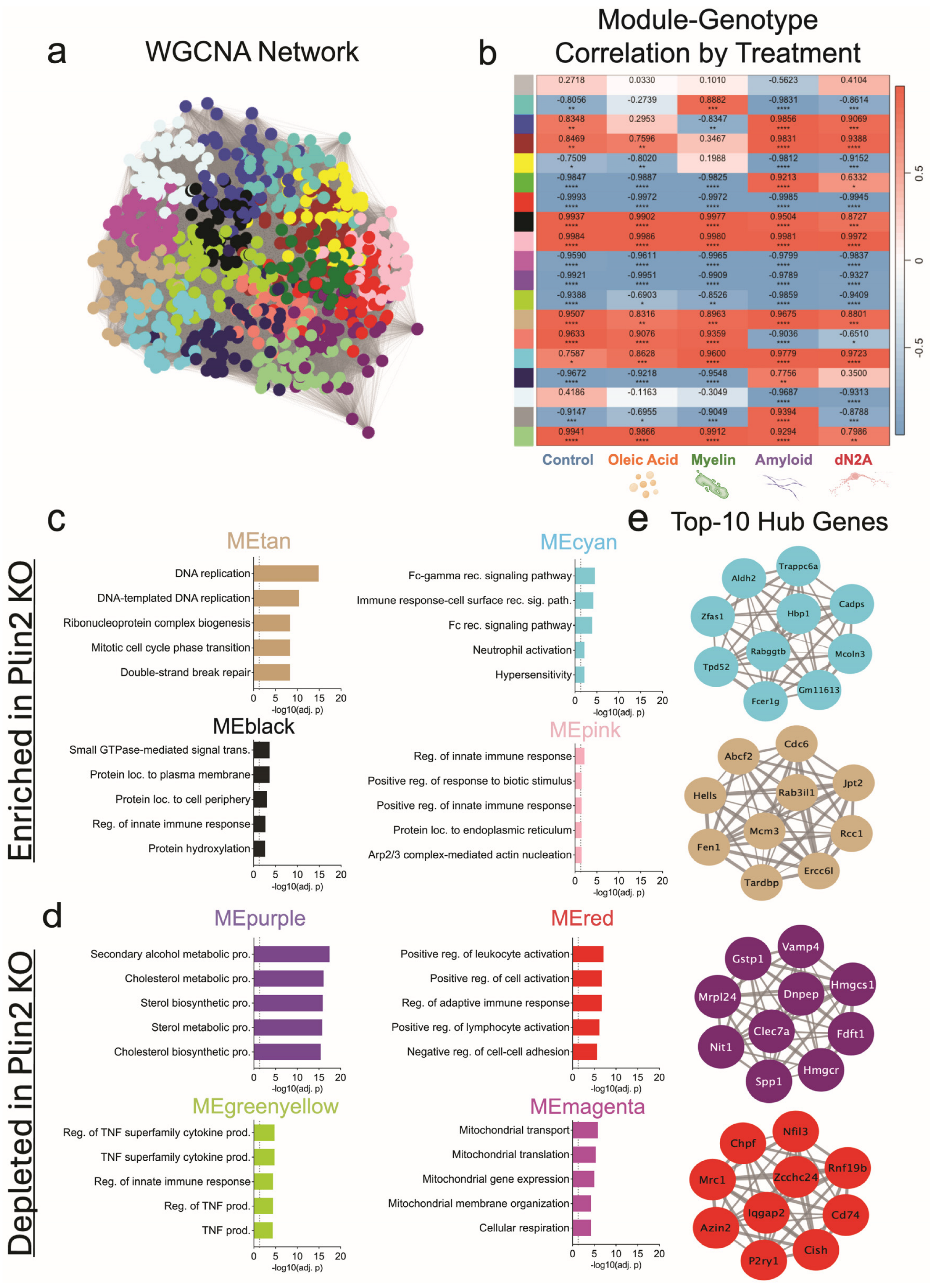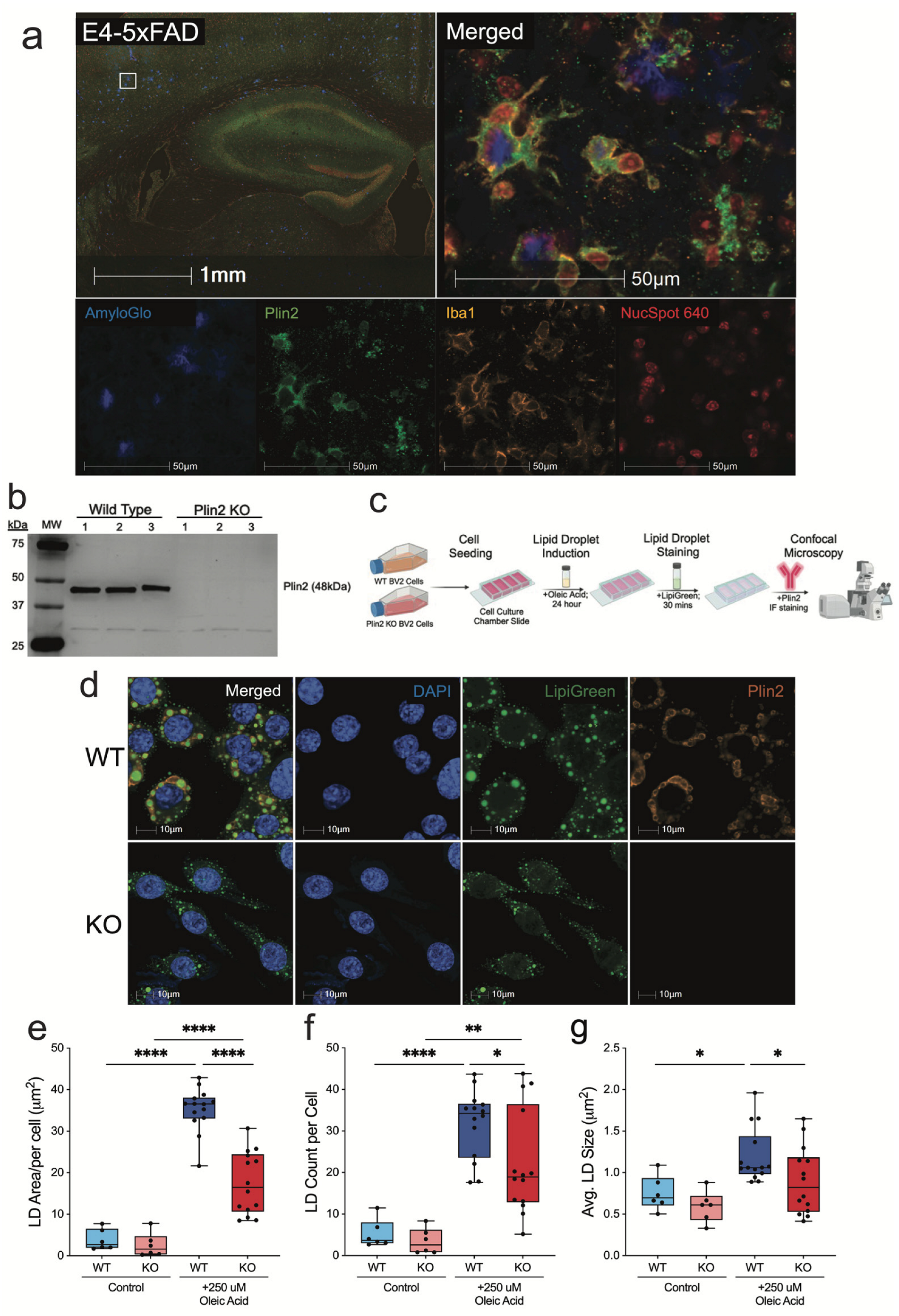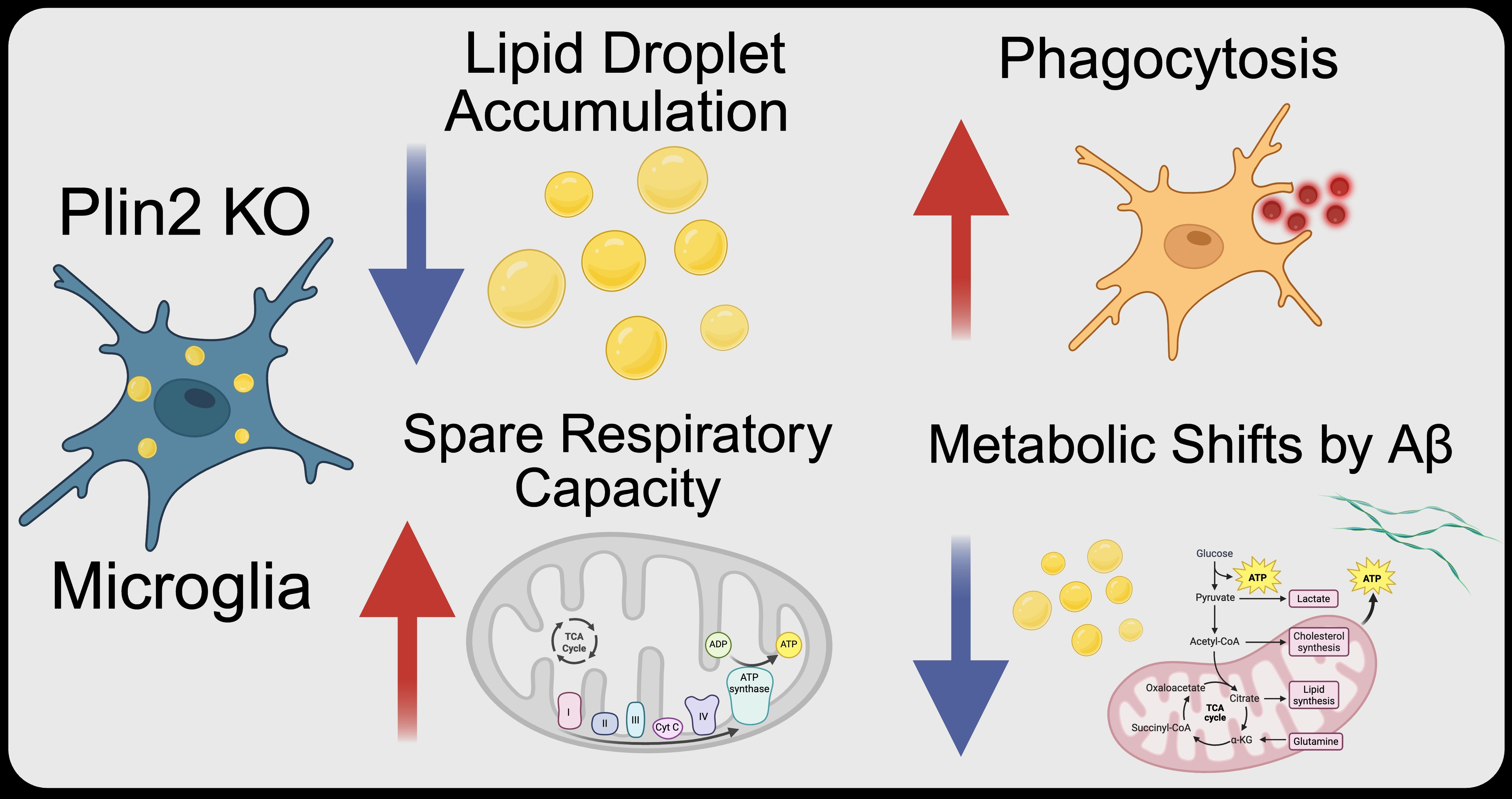 - Knockout of Plin2 in microglia reduces lipid droplet burden, while enhancing phagocytic clearance capacity.