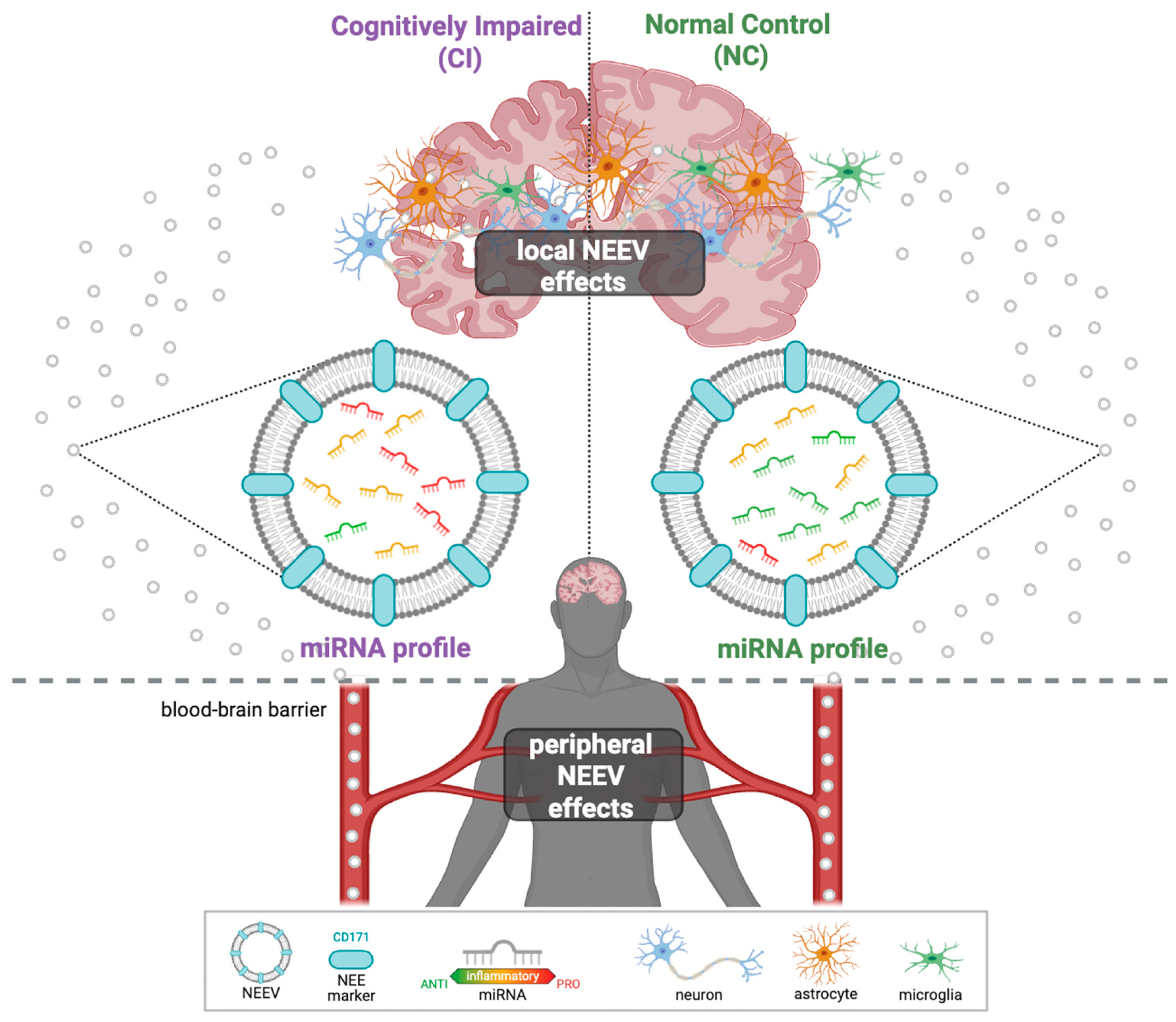 - Population-specific NEEV miRNAs (MAs: hsa-miR-26a-5p, hsa-let-7f-5p, and hsa-miR-139-5p, NHWs: hsa-miR-133a-3p, hsa-miR-125b-5p, and hsa-miR-100-5p) were identified as potential blood-based biomarkers for Alzheimer’s disease (AD) and related cognitive impairment.