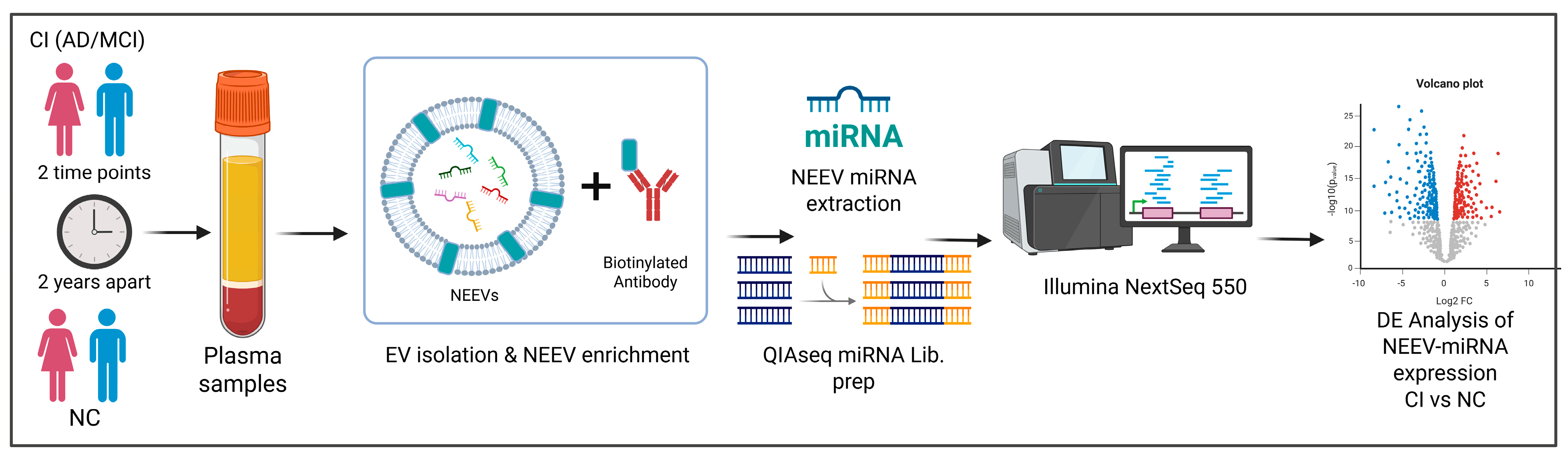 - Durur, D.Y.; Tastan, B.; Ugur Tufekci, K.; Olcum, M.; Uzuner, H.; Karakülah, G.; Yener, G.; Genc, S. Alteration of miRNAs in Small Neuron-Derived Extracellular Vesicles of Alzheimer’s Disease Patients and the Effect of Extracellular Vesicles on Microglial Immune Responses. J. Mol. Neurosci. 2022, 72, 1182–1194. [Google Scholar] [CrossRef] [PubMed]