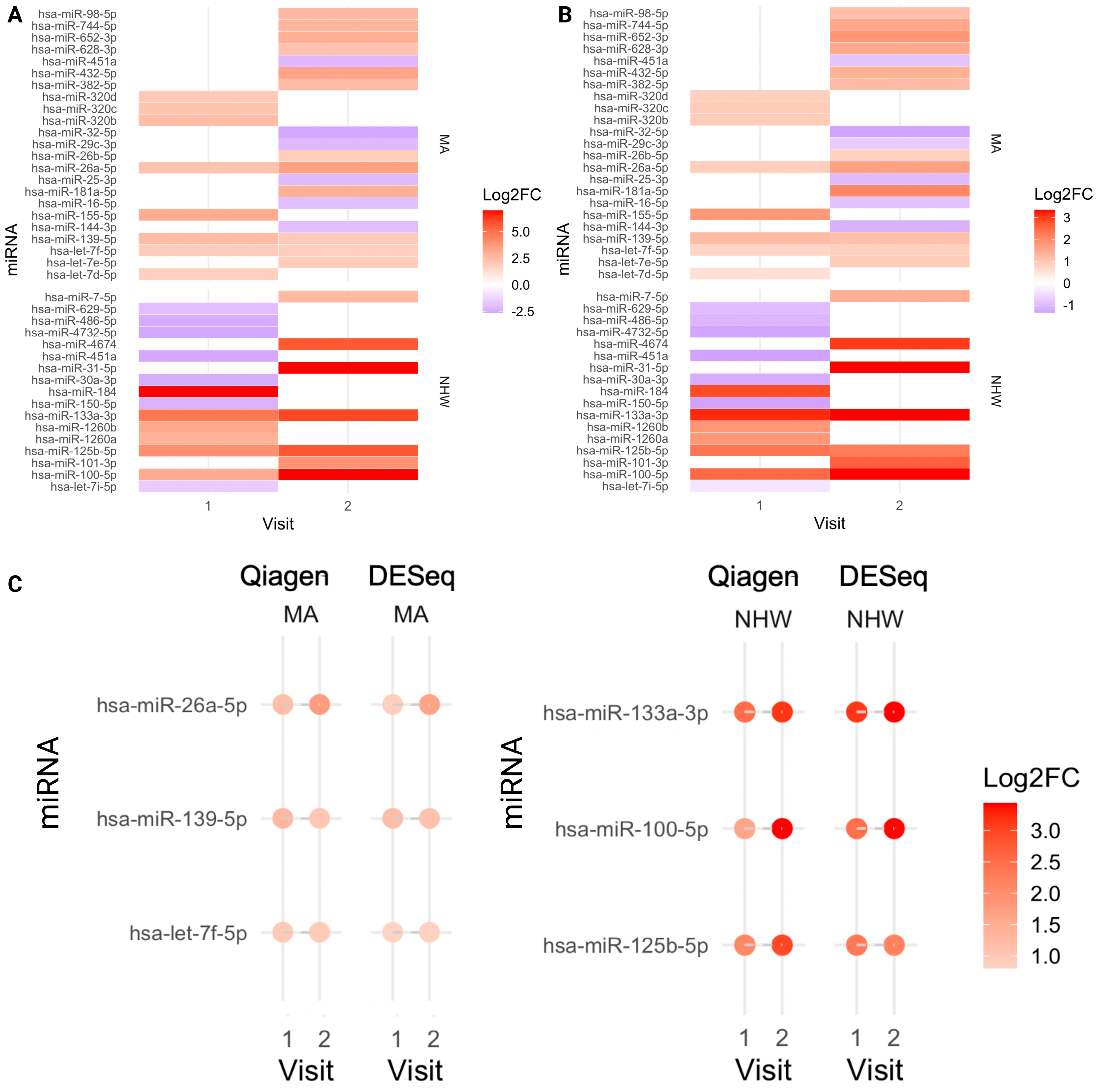- hsa-let-7a-5p, hsa-let-7g-5p, and hsa-miR-122-5p were significantly DE in both MAs and NHWs when both the visits were analyzed (Supplementary Document S2; Table S6). hsa-miR-122-5p was underrepresented, and hsa-let-7a-5p was overrepresented in both population groups. hsa-let-7a-5p showed significant association with APOE4 index and the metabolic index in NHWs at Visit 2 but not in MAs. Notably, hsa-let-7g-5p was overrepresented in MAs but underrepresented in NHWs (Supplementary Document S1; Tables S2 and S3).