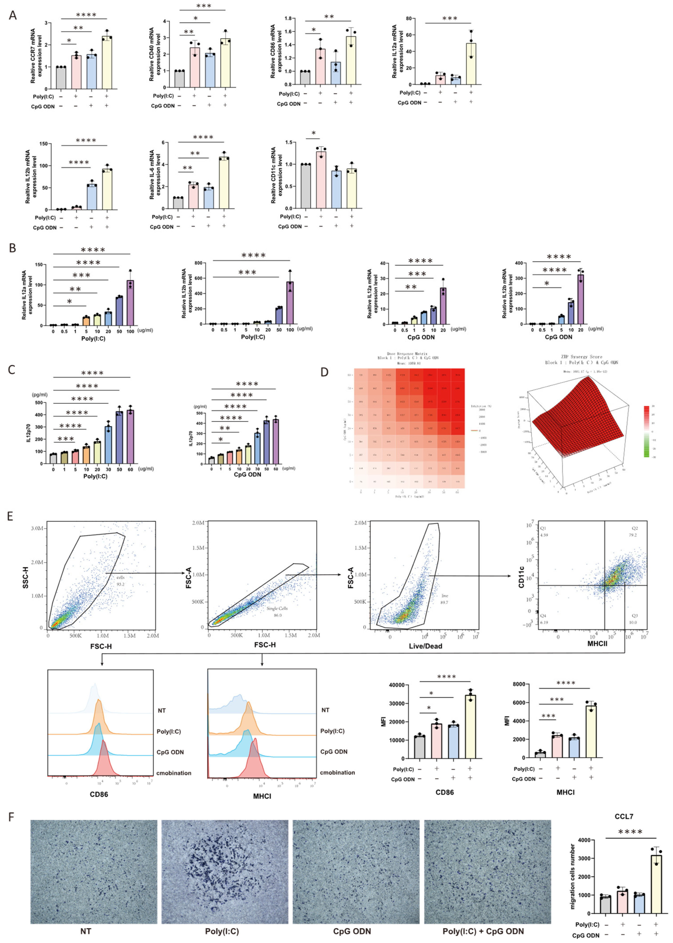 Mouse Bone Marrow-Derived DC Vaccines: Mouse bone marrow-derived dendritic cells (BMDCs) were stimulated for 24 h under one of the following four conditions: (1) PBS (untreated control); (2) 10 ug/mL poly(I:C) alone; (3) 10 ug/mL CpG ODN alone; (4) a combination of 10 ug/mL poly(I:C) and 10 ug/mL CpG ODN. Following stimulation, the DCs were pulsed with whole tumor lysate antigen (at a DC to tumor cell ratio of 1:3) for an additional 24 h to generate antigen-loaded DC vaccines.