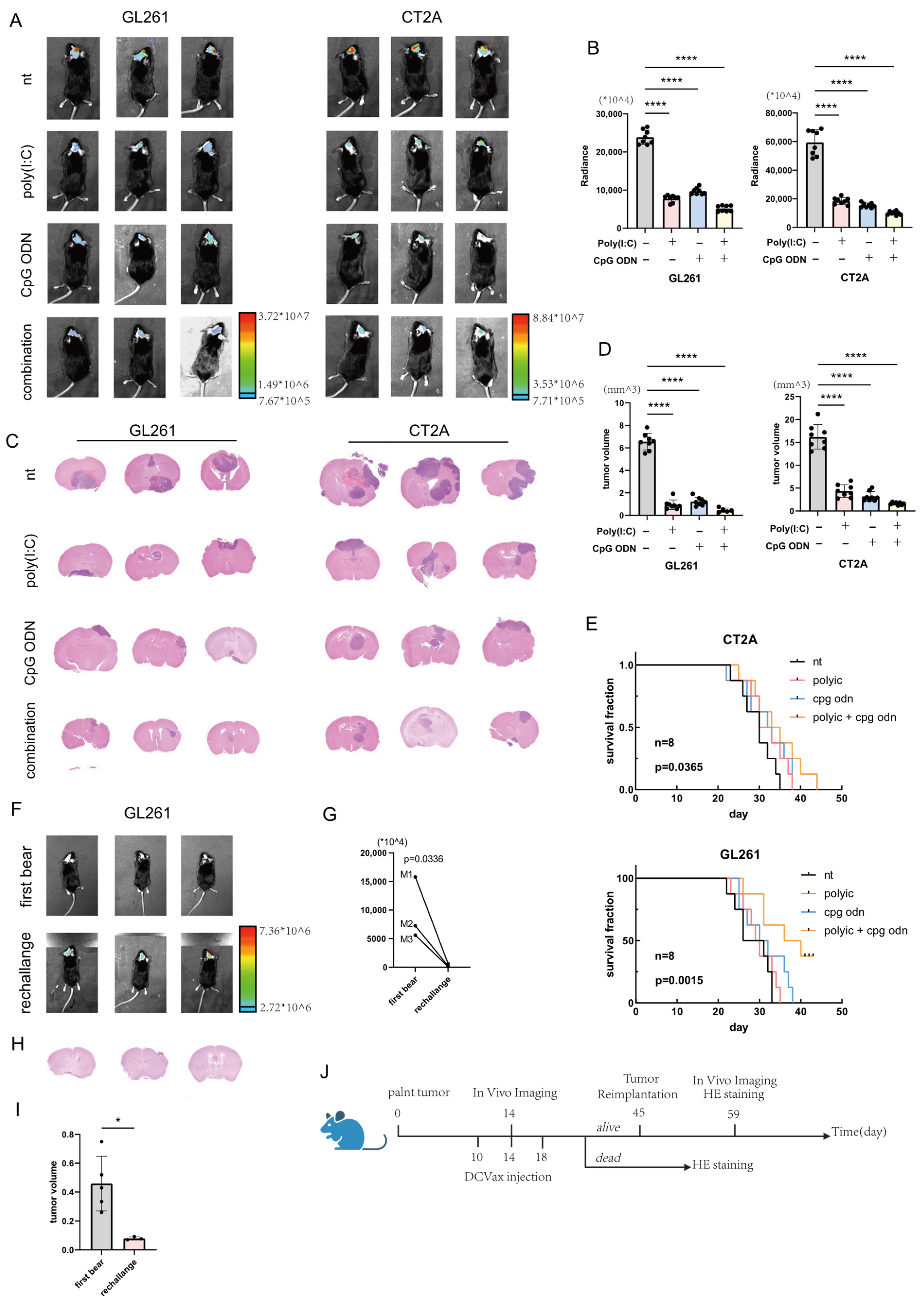 On day 0, glioma cells stably transfected with the luciferase gene were digested, washed and then resuspended at a density of 50,000 cells per mouse. The cell suspension was intracranially injected into the right hemisphere of anesthetized mice using a stereotactic instrument (68801, RWD, Shenzhen, China). On days 10, 14, and 18, each mouse received 200,000 dendritic cell vaccines via tail vein injection. On day 14, anesthetized mice were intraperitoneally injected with 150 mg/kg D-luciferin sodium (HY-12591, MCE, Shanghai, China). Bioluminescence intensity in the brain was monitored using a small animal in vivo imaging system (LAGO X, Spectral Instruments Imaging, Tucson, AZ, USA) within 10–40 min post-injection. Mice surviving beyond day 45 without significant symptoms underwent tumor reimplantation. Bioluminescence signals were reassessed on day 59. The longest diameter (L) and the perpendicular shortest diameter (W) of the tumor region were measured in the scanned sections using CaseViewer software (version 2.4.0.119028), and the tumor volume was estimated using the formula V = 1/2 × L × W2.