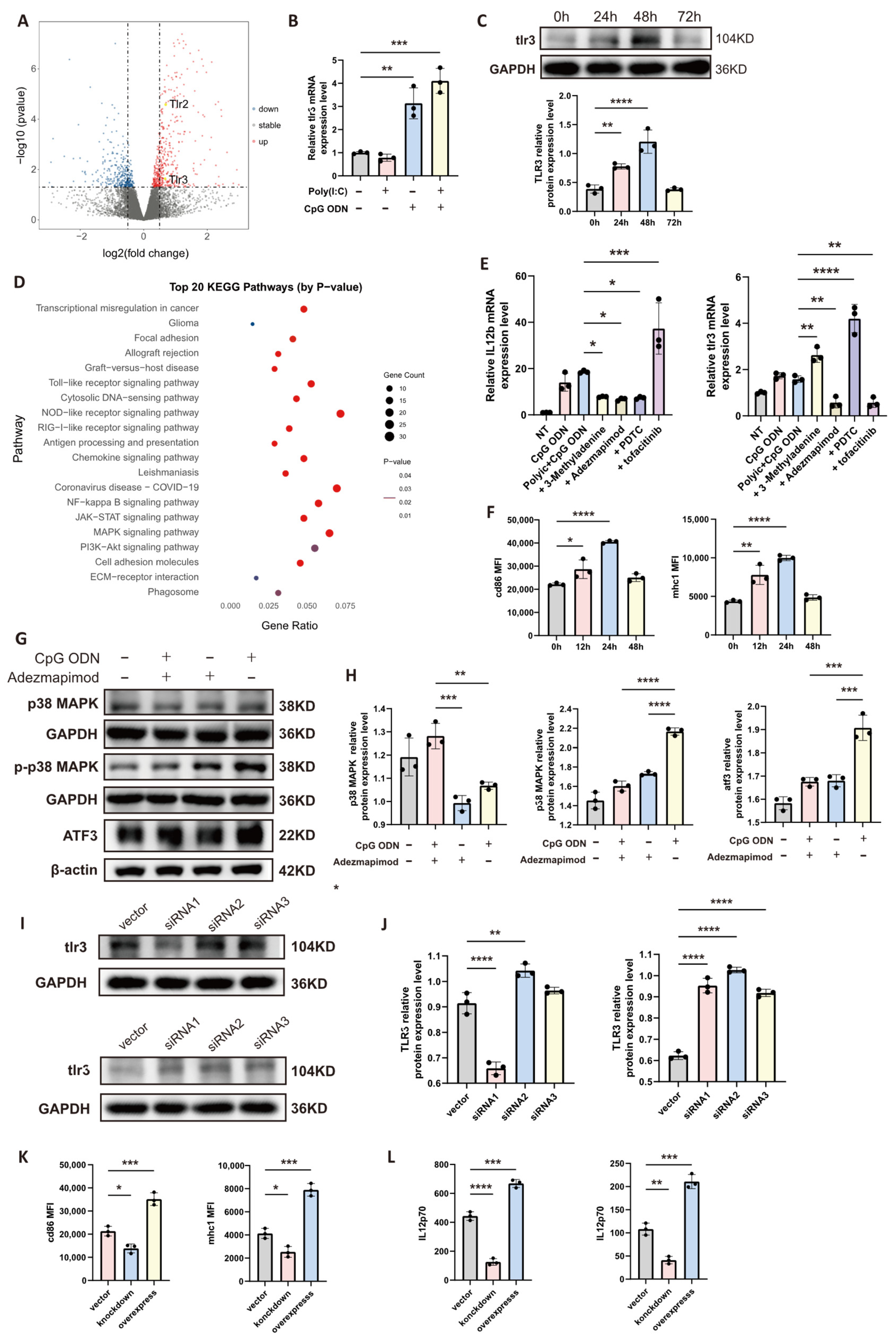 Mature dendritic cells (DCs) cultured in vitro were distributed into six independent culture dishes. Three dishes were designated as the untreated control group, while the other three were stimulated with a combination of 10 ug/mL CpG ODN and 10 ug/mL poly(I:C) for 24 h. Total RNA was subsequently extracted from all cell samples for transcriptome sequencing. The sequencing was performed on an Illumina platform, with an average sequencing data volume of approximately 6 Gb per sample to ensure sufficient transcriptome coverage. The Q30 base calling accuracy rate for all samples exceeded 85%, guaranteeing the reliability of the raw data. Bioinformatic analysis followed a standardized pipeline. The raw sequencing data were first subjected to quality control filtering using fastp software (version 0.23.4) to remove adapter sequences and low-quality reads. The clean data were then aligned to the appropriate reference genome using the HISAT2 software (version 2.2.1). Gene expression levels were quantified using HTSeq software (version 0.11.2), presented as raw read counts, and further converted into FPKM values for cross-sample comparisons. Differential expression analysis was conducted using the DESeq2 R package (version 1.36.0). Its internal pipeline includes a normalization step that corrects for sequencing depth variation in the raw read counts. Significantly differentially expressed genes were identified using a threshold of an adjusted p-value less than 0.05 and an absolute log2 fold change greater than 1. Based on this analysis, a volcano plot was constructed to visualize the overall distribution of differential genes. For genes significantly upregulated in the combination treatment group, KEGG pathway enrichment analysis was performed using the cluster Profiler tool. The enriched pathways were ranked according to the adjusted p-value of the enrichment results. The top 20 most significantly enriched signaling pathways were selected, and their enrichment significance along with the expression patterns of associated genes were visualized using a heatmap.