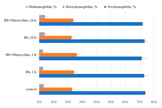 The ratio of hemoglobin ligand forms in the presence of minocycline (p ≤ 0.05). The major alterations are found in 24 h of MC incubation with Hb.