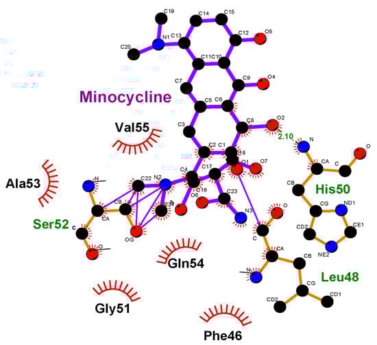 Interaction of amino acid residues in the hemoglobin with minocycline molecules. Ala53, Ser52, Phe46, Gly51, Leu48, Gln54, His50, Val55—amino acid residues of the Hb.