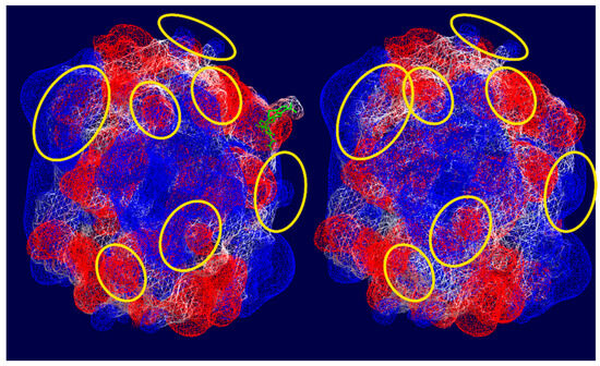 Visualization of electrostatic potential of hemoglobin surface using Swiss PDB viewer. Color representation: Blue—Positive charge, Red—Negative charge, White—Neutral charge, Green—Minocycline. Hemoglobin surface in the initial state (on high) and in the presence of minocycline (under). The molecules with the most pronounced changes in electrostatic potential are highlighted in yellow ovals.
