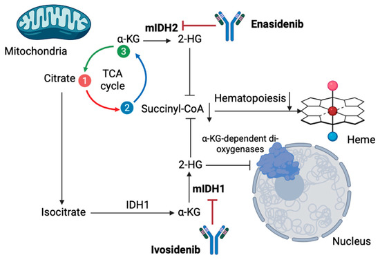 Metabolic targeting in MDS with monoclonal antibodies Enasidenib and Ivosidenib. Ivosidenib and Enasidenib demonstrate potential for MDS treatment by eliminating oncometabolite 2-H by targeting mIDH1 and mIDH2, respectively. As a result, normal hematopoiesis in MDS is restricted [α-KG: α-Ketoglutaric acid; mIDH1/2: mutated isocitrate dehydrogenases 1/2; 2-HG: 2 hydroxyglutarate; TCA: trichloroacetic acid] (the figure was created using BioRender software version 04, License # OE28U5DG3U).