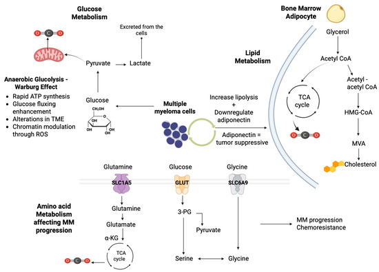 An illustration of how glucose, lipid, and amino acid metabolism affect MM progression is provided in Figure 2.