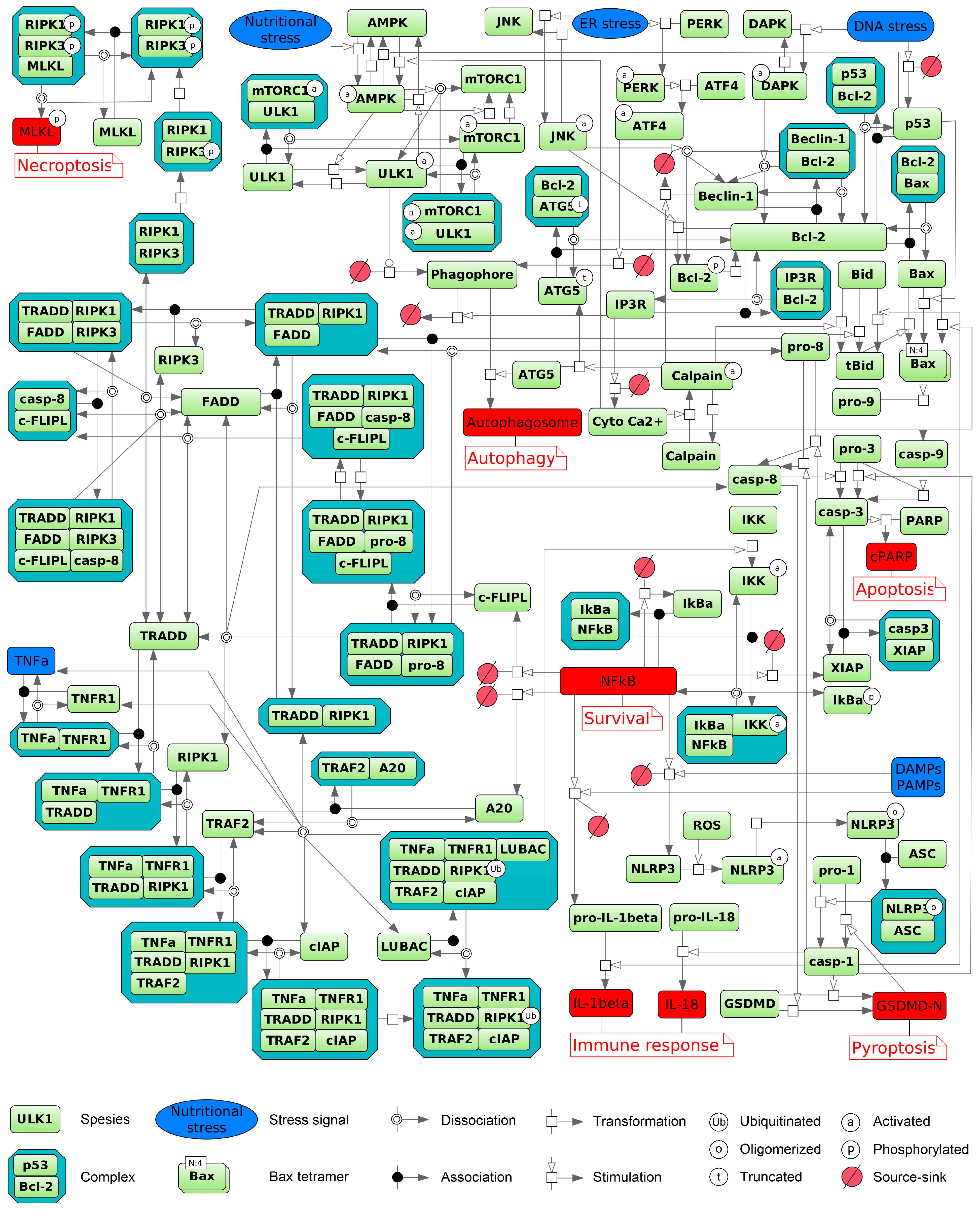 - Existing ordinary differential equation models incorporate no more than two regulated cell death types simultaneously, limiting their capacity to capture the full complexity of pathway crosstalk and coordination.