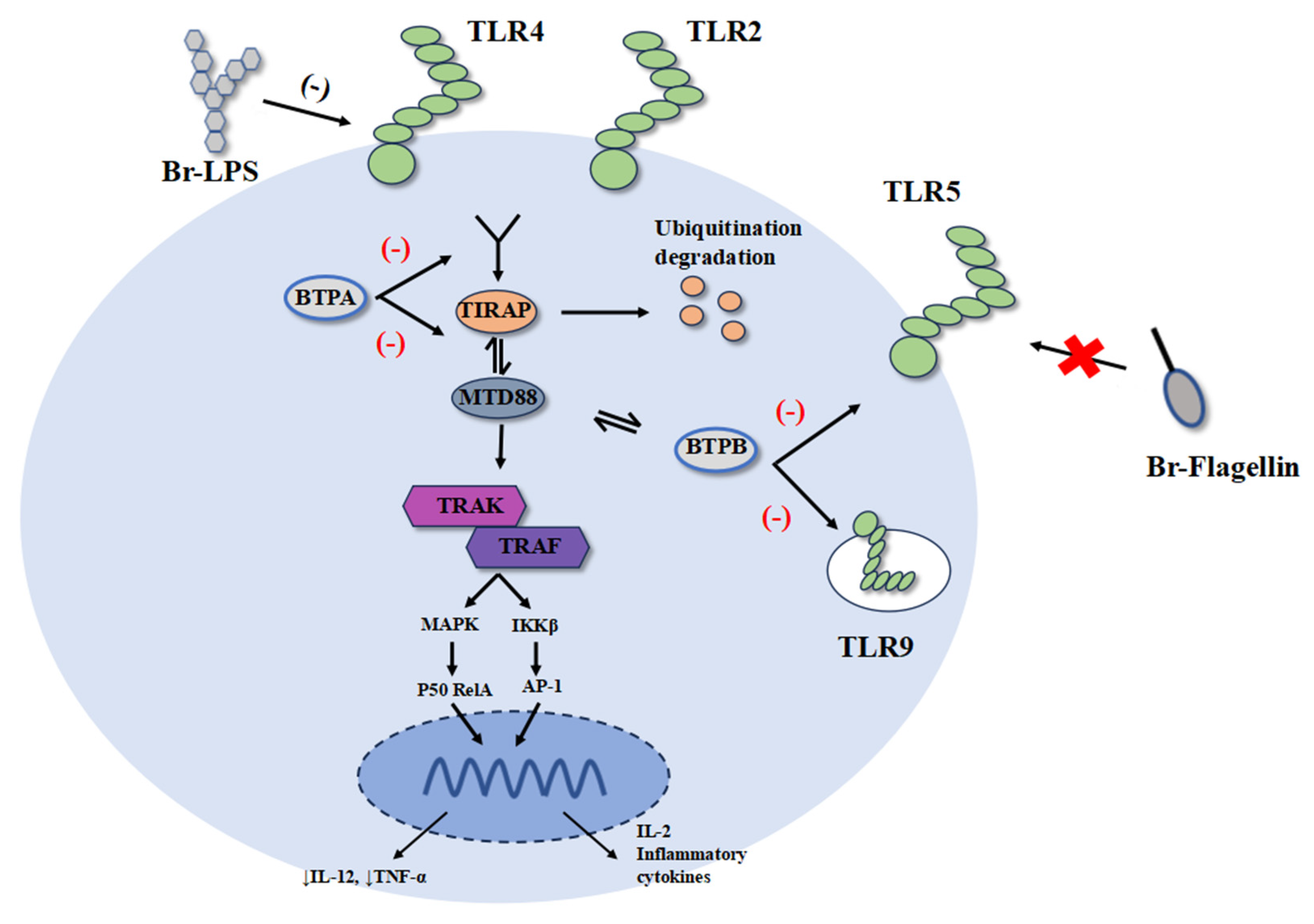 | BtpB | MyD88, TLR2/4/5/9 | Strong inhibitor of multiple TLR pathways; interacts strongly with MyD88; suppresses NF-κB and NLRP3 inflammasome; possesses NAD+ hydrolase activity | BtpB |