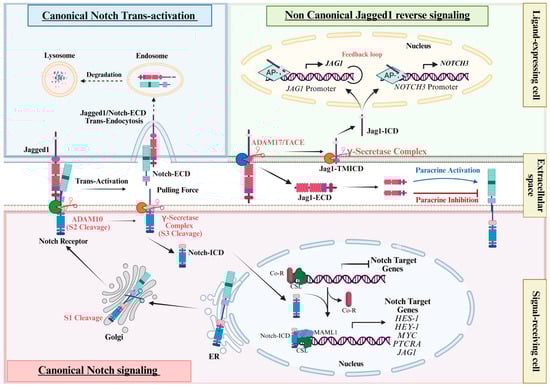 Similarly to the Notch receptor, Jagged1 undergoes sequential proteolytic processing. The first cleavage occurs in the juxtamembrane region and is mediated by ADAM-17/TACE, resulting in the shedding of the soluble Jagged1 extracellular domain (sJag1-ECD) and the generation of a membrane-tethered C-terminal fragment (Jag1-TMICD) [162,163]. This is followed by intramembrane proteolysis catalyzed by the presenilin/γ-secretase complex, which releases the intracellular domain of Jagged1 (Jag1-ICD). Once liberated, Jag1-ICD translocates into the nucleus, where it functions as a signaling molecule, potentially regulating gene expression independently of canonical Notch activation [164] (Figure 1, non-canonical Jagged1 reverse signaling).
