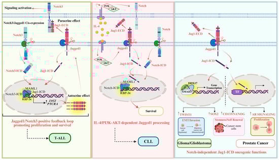 Context-specific oncogenic functions of Jagged1 signaling. Jagged1 exerts a distinct oncogenic role depending on the cellular and molecular context, acting as either a Notch-co-activator or as an autonomous nuclear effector. In T-ALL (left panel), nuclear Jag1-ICD cooperates with Notch3-ICD and RBP-Jκ transcription factor within a transcriptional complex that amplifies JAG1 expression, establishing a positive feedback loop that reinforces Notch activation in both ligand and receptor-expressing cells, thereby sustaining leukemic cell proliferation and survival. In CLL (central panel), IL-4 promotes JAG1 expression and proteolytic processing through the PI3K/AKT signaling, concomitant with increased Notch activation, that correlates with enhanced cell survival. Conversely, in Glioma/Glioblastoma (right panel), Jag1-ICD exerts Notch-independent transcriptional activity by integrating into a DDX17/SMAD3/TGIF2 complex that induces SOX2 and TWIST1 expression to sustain self-renewal and EMT-related invasiveness. In prostate cancer (right panel), Jag1-ICD potentiates AR signaling and upregulates CD133 and NANOG expression, reinforcing cancer stem-like properties and malignant progression. Red solid arrows indicate activation event and nuclear translocation. In the figure, black solid arrows denote transcriptional induction. Yellow circles mark oncogenic nodes, highlighting factors that exert tumor-promoting effects in the depicted pathways. Background colors distinguish tumor types: green for T-ALL, pink for CLL and light blue for Glioma/Glioblastoma and prostate cancer. The figure is created in https://BioRender.com. URL accessed on 14 November 2025.