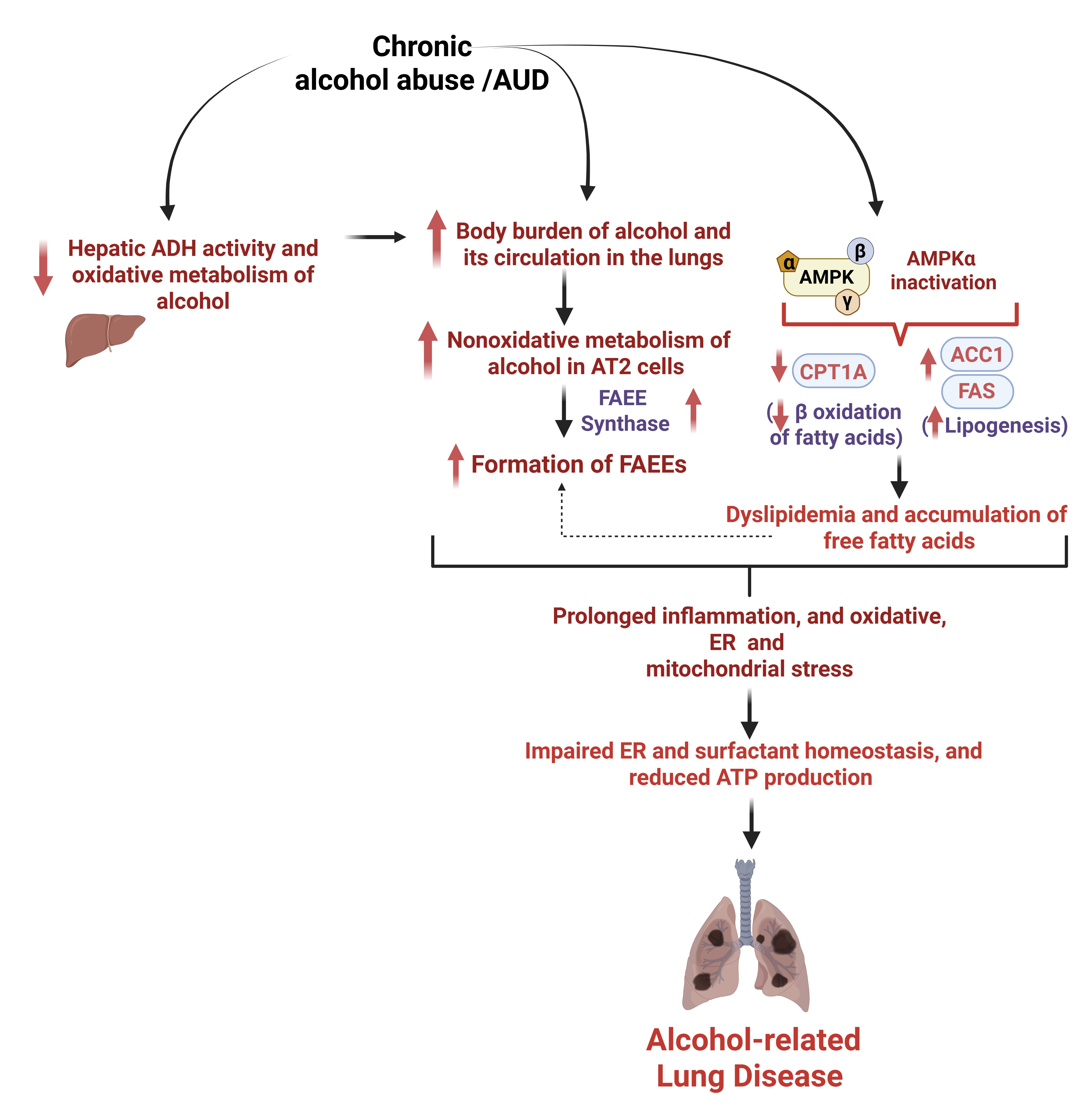 Srinivasan, M.; Kaphalia, B.S. Lipid Metabolic Changes and Mitochondrial Stress in Ethanol-Treated Alveolar Type II Epithelial Cells: Initial Events Leading to Alcoholic Chronic Lung Disease. Cells 2025, 14, 1817. https://doi.org/10.3390/cells14221817