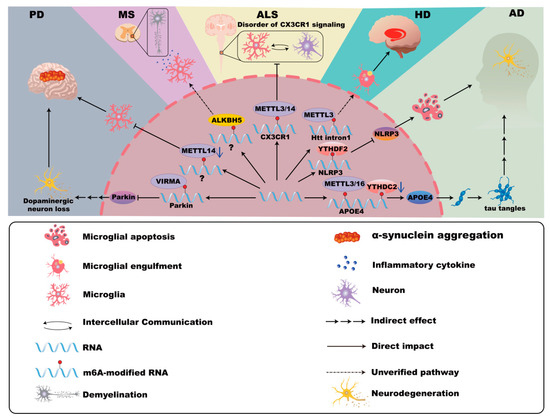 m6A modifications in microglia in neurodegenerative disease. In Alzheimer’s disease (AD), the expression of APOE4 is associated with YTHDC2, METTL3, and METTL16, promoting neurodegeneration. Furthermore, YTHDF2 inhibits microglial NLRP3/caspase-1/GSDMD signaling, potentially mitigating the damage associated with AD in the central nervous system. In Parkinson’s disease (PD), VIRMA-mediated m6A methylation suppresses Parkin translation, enhancing microglial activation, dopaminergic neuron loss, and neuroinflammation. Mettl14 deletion in the substantia nigra intensifies microglial activation and exacerbates PD pathology. In Huntington’s disease (HD), the abundant m6A modifications in mHTT transcripts may be related to the pathogenic mechanism of microglia. In Multiple Sclerosis (MS), the m6A modification mediated by ALKBH5 may have the possibility of influencing the microglial pyroptosis and inflammation. In Amyotrophic lateral sclerosis (ALS), m6A modifications in CX3CR1 of microglia disrupt the communication between neurons and glial cells.