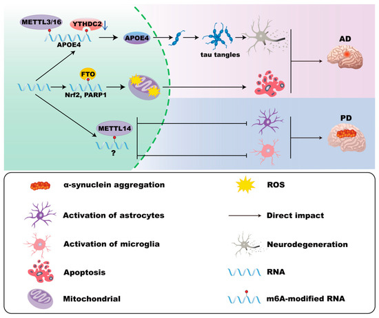 m6A modifications in astrocytes in AD and PD. In Alzheimer’s disease (AD), ApoE4 expression is associated with elevated METTL3/METTL16 and decreased YTHDC2 levels in astrocytes, which correlates with enhanced neurotoxicity. Moreover, FTO and YTHDF1 in astrocytes induce mitochondrial dysfunction and oxidative stress. In Parkinson’s disease (PD), the loss of Mettl14 in the substantia nigra increases astrocyte activation.