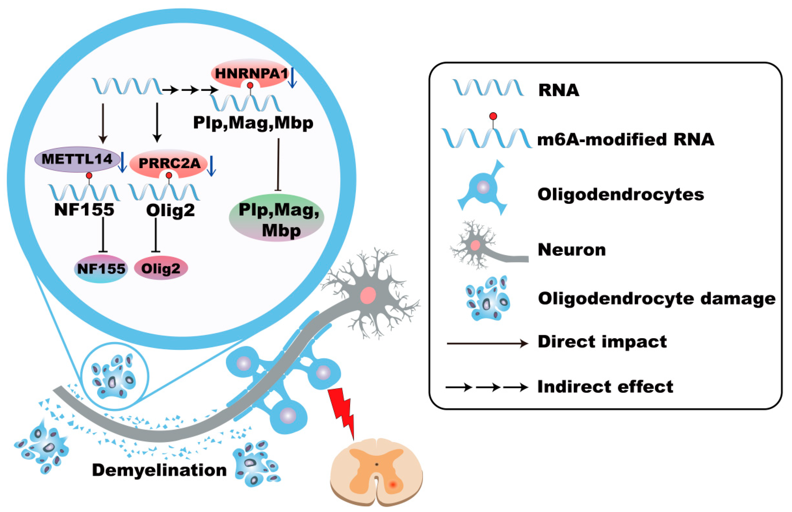 | Oligodend-rocytes | MS | METTL14 | The decrease in NF155 | [139,140] |