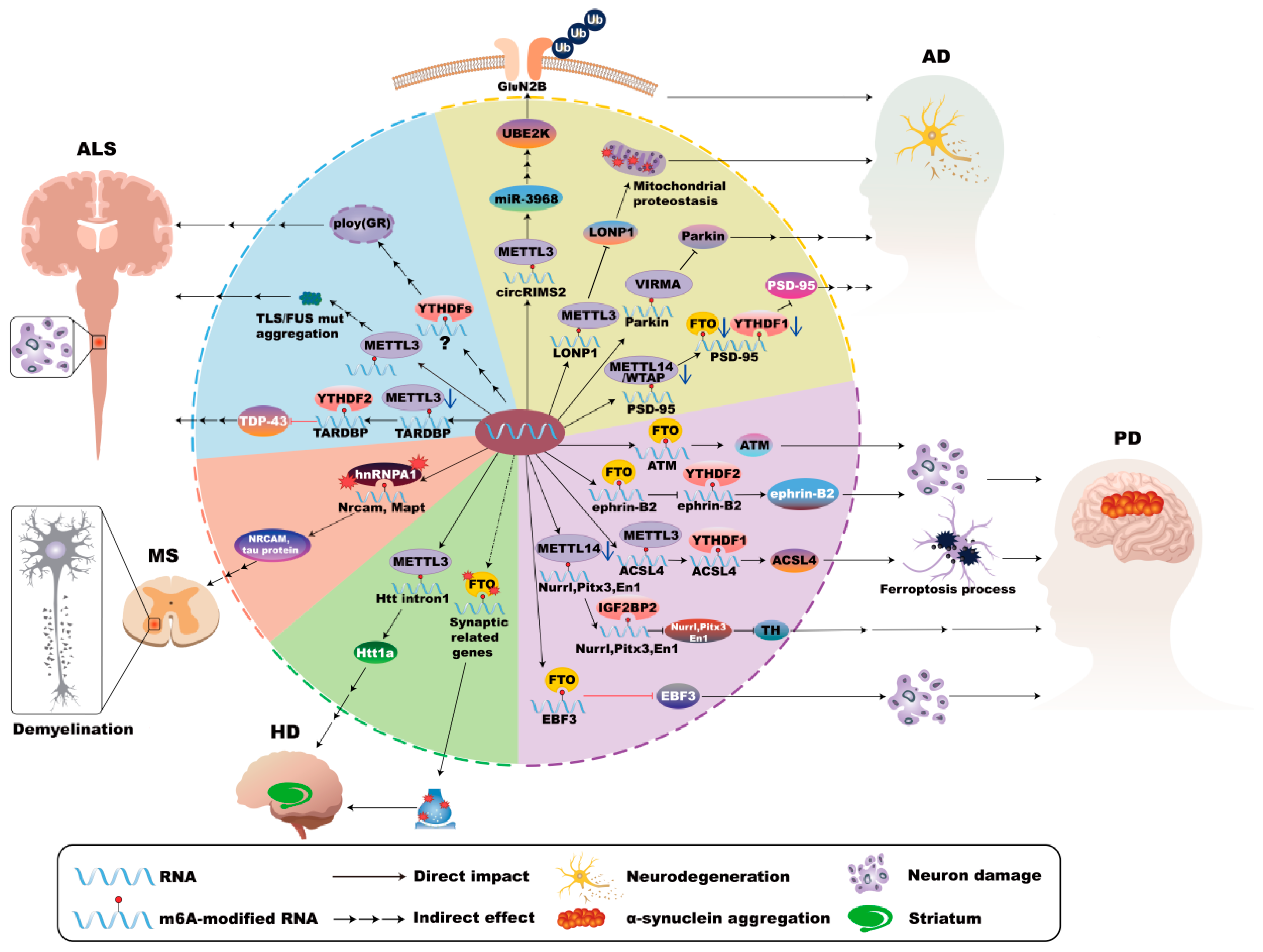 | HD | METTL14, FTO | Disrupted the translation or proper processing of synaptic genes | [57] |