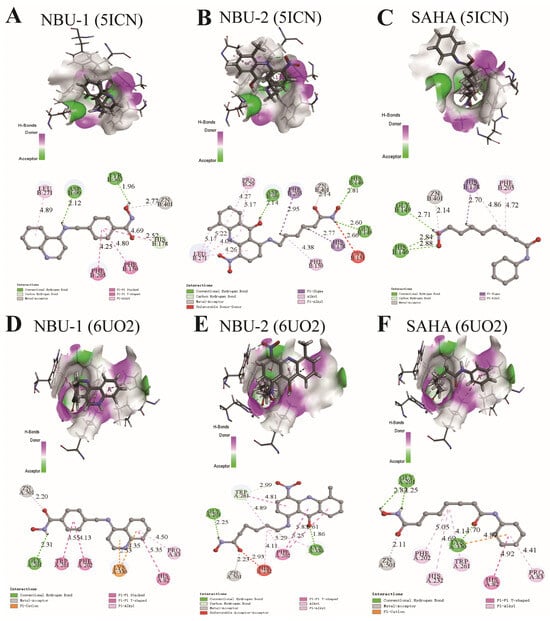 Molecular docking analysis of NBU-1 with HDAC1 (PDB ID: 5ICN, Figure 1A) revealed that the hydroxyl group of the hydroxamic acid moiety coordinated with the Zn2+ ion, while also forming a hydrogen bond with Tyr303. The amino group at the 4-position of the quinoline ring formed another hydrogen bond with Asp99. In addition, the benzene ring and quinoline ring formed multiple Pi-Pi interactions with Phe205, Phe150, His178, and a Pi-alkyl interaction with Leu271. Compared with NBU-1, NBU-2 had more interactions with HDAC1 protein (Figure 1B). In addition to forming a coordination bond with the zinc ion, the hydroxamic acid group also interacted with His140 and Gly149 through two hydrogen bonds. The planar conjugated aromatic acridone scaffold in NBU-2 was situated within a hydrophobic region, enabling the formation of several Pi-alkyl interactions with Leu271 and Pro29. In addition, the aliphatic flexible linker also formed multiple Pi-sigma and Pi-alkyl interactions with residues Phe205, Phe150, and His178. The binding modes of NBU-1 and NBU-2 against HDAC6 protein (PDB ID: 6UO2) were similar, as shown in Figure 1D,E. It should be noted that NBU-2 formed two hydrogen bonds with Gly201 and Lys330, and a hydrocarbon bond with Trp261, which showed more advantages than NBU-1. As a control, the docking results of SAHA with HDAC1 and HDAC6 were shown in Figure 1C,F, respectively.