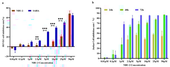 NBU-2 on the proliferation of HUVEC and Jurkat cells. (a) Cell viability through the use of an MTT assay. HUVECs were treated with different concentrations of NBU-2 (0.01, 0.1, 1, 2.5, 5, 10, 25, and 50 µM) for 72 h. (b) Cell viability through the use of a CCK-8 assay. Jurkat cells were treated with NBU-2 for different amounts of time. ** p < 0.01, *** p < 0.001.