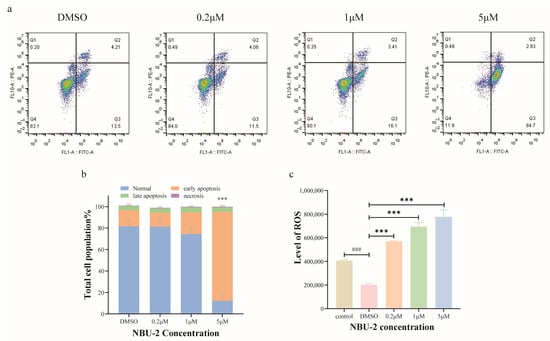 NBU-2 induces apoptosis in Jurkat cells. (a) Apoptosis in Jurkat cells; (b) Percentage of apoptotic cells at each stage of apoptosis. (c) Reactive oxygen detection. Data are shown as the mean ± SD from three independent experiments (n = 3). ### p < 0.001, *** p < 0.001.