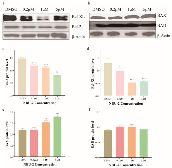 Bcl-2 family proteins are essential in apoptosis, where they are found in the endoplasmic reticulum and mitochondrial outer membrane [,]. Bcl-2 and Bcl-XL are two prominent members of this family, which act as “protectors” and possess anti-apoptotic functions. Whereas BAX is mainly located in the cytoplasm and acts as an effector to promote apoptosis (Pro-apoptotic) []. BAD, on the other hand, indirectly initiates apoptotic signaling by binding to the anti-apoptotic Bcl-2 protein, thus preventing it from controlling the pro-apoptotic BAX and BAK [,]. Figure 7 shows the expression of Bcl-2 family proteins in Jurkat cells after NBU-2 treatment, respectively. For the anti-apoptotic proteins Bcl-2 and Bcl-XL, the experimental results showed the same phenomenon, in whcih the expression of these two proteins was reduced by the effect of NBU-2. In turn, the pro-apoptotic protein BAX increased with the concentration of NBU-2, in contrast to BAD, which was unaffected by NBU-2. From this, we concluded that NBU-2 is inducing Jurkat cells to perform an apoptotic program by stimulating an increase in the expression of the pro-apoptotic protein BAX and a decrease in the expression of the pro-survival protein Bcl-2 and Bcl-XL.
