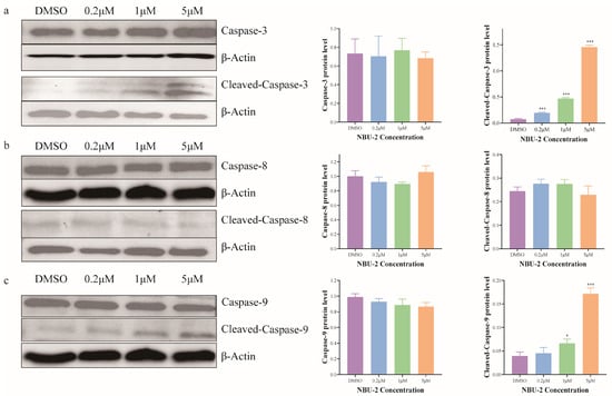 The exogenous pathway (death receptor pathway) and the endogenous pathway (also known as the mitochondrial or BCL-2 regulatory pathway) are two triggering mechanisms for apoptosis. The exogenous pathway is induced by the activation of the death receptor on the plasma membrane, which induces the activation of caspase-8. Caspase-9 activation, on the other hand, is an endogenous pathway induced intracellularly by various stress stimuli. Once the initiators Caspase-8 and Caspase-9 are activated, endogenous and exogenous apoptosis share common pathway components, Cleaved-Caspase-3 and Cleaved-Caspase-7, which act as executioners to perform various apoptotic actions []. Hence, we also examined the expression of Caspase-8, 9, 3 and Cleaved-Caspase-8, 9, 3 proteins using Western blot. The results of the experiments were demonstrated in Figure 8, which showed that NBU-2 did not affect the expression of the three prototypes of Caspase-8, 9, and 3, whereas the expression of Cleaved-Caspase-9 and Cleaved-Caspase-3 increased with the increase in the concentration of NBU-2. This phenomenon indicated that NBU-2 induced apoptosis through an endogenous pathway.