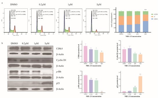 Effect of NBU-2 on the induction of cell-cycle arrest. (a) Flow cytometry analysis of the cell cycle. (b) Western blotting analysis of Cell cycle-related proteins. (CDK4, Cyclin D1, p-Rb and p21). Data are shown as the mean ± SD from three independent experiments (n = 3). * p < 0.05, ** p < 0.01, *** p < 0.001.