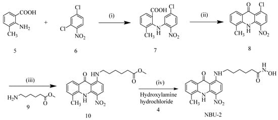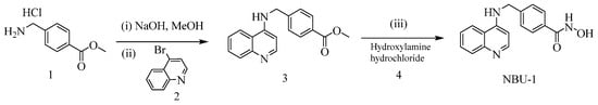 The synthesis routes of NBU-1 and NBU-2 were described in Scheme 1 and Scheme 2. For the synthesis of NBU-1, methyl 4-(aminomethyl)benzoate hydrochloride 1 and 4-bromoquinoline 2 were used as starting materials, and intermediate 3 was obtained by N-nucleophilic substitution reaction. Finally, the target compound NBU-1 was obtained by reacting with hydroxylamine hydrochloride 4; For the synthesis of NBU-2, using 2-amino-3-methylbenzoic acid 5 and 2,4-dichloro-1-nitrobenzene 6 as starting materials, the benzoic acid 7 was obtained through Cu-catalyzed Ullmann reaction. Friedel-Crafts acylation in concentrated sulfuric acid afforded acridone 8, which was transformed into intermediate 10 via N-nucleophilic substitution with amine 9. Subsequent reaction with hydroxylamine hydrochloride 4 yielded NBU-2. The structures of all target compounds were verified by 1H NMR, 13C NMR, and high-resolution mass spectrometry (HRMS).