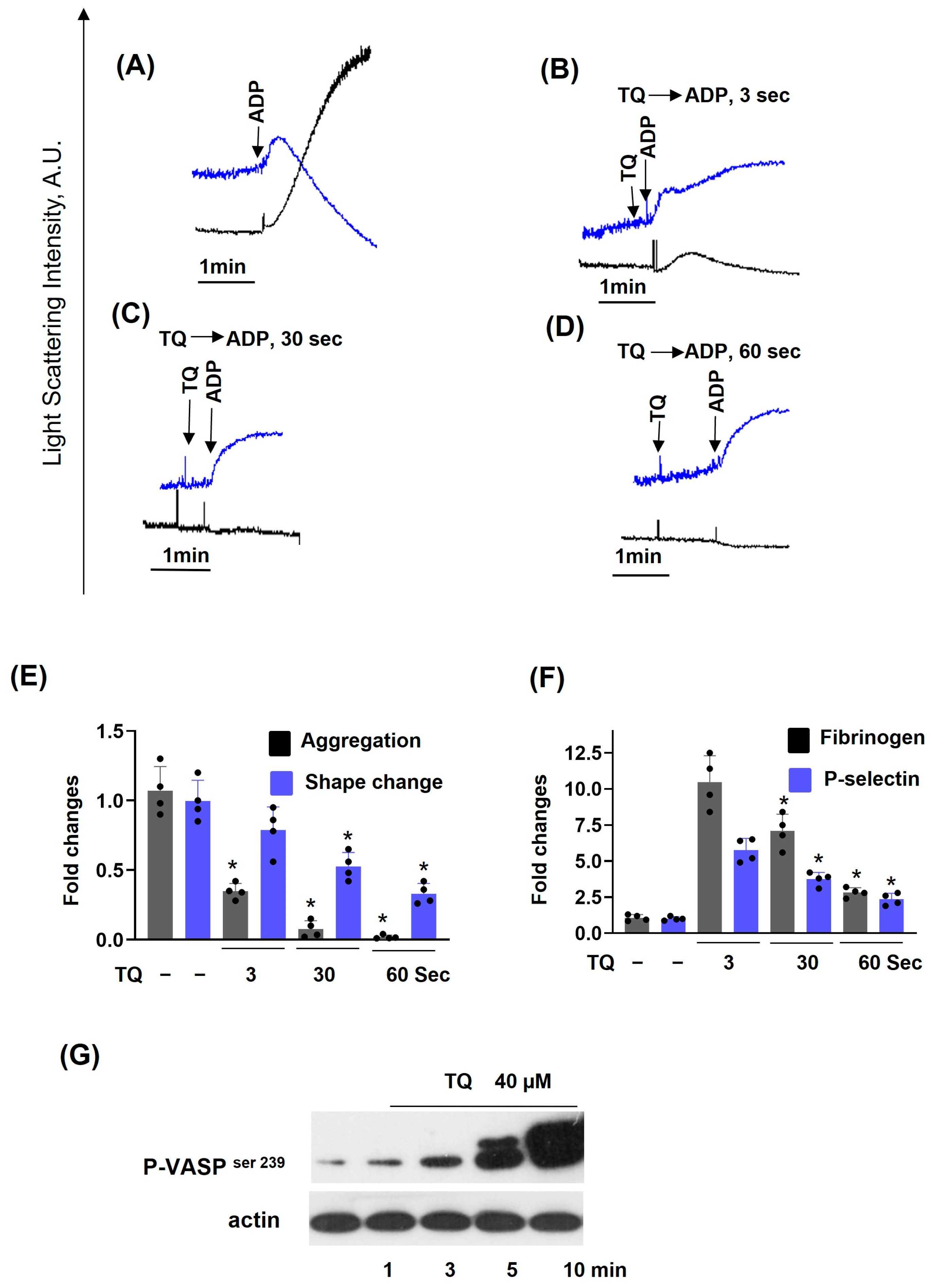 Figure 1. Inhibition of ADP-induced platelet activation is independent of PKA activation. PRP was diluted in HEPES buffer to maintain a platelet concentration of 2 × 107/mL and was stimulated with ADP (1 µM) or preincubated with TQ (40 µM) for the indicated time. Aggregation and shape change reaction were analyzed by LaSca-TM device. Aggregation was analyzed as AUC; shape change was assessed as changes in velocity (Vshape). LSI AU—light scattering intensity in arbitrary units at 1° for shape change reaction (blue lines) and at 12° for aggregation (black lines). For details, see Supplementary Figure S2A,B. (AD) are original records; (E,F) are the summary data from four independent experiments (four different blood donors). Data (means ± SD, n = 4, * significant differences from ADP-alone samples, p < 0.05) are presented as fold changes where ADP was taken as 1. Flow cytometry analysis of integrin αIIbβ3 activation and P-selectin expression in washed platelets (WP) stimulated with Trap-6 (10 µM, 2 min) or preincubated with TQ for the indicated time. Data (means ± SD, n = 4, * significant differences from Trap-6-alone samples, p < 0.05) are presented as fold changes where Trap-6 was taken as 1. (G), Western blot analysis of time-dependent TQ-induced VASP phosphorylation in washed platelets. Representative blots from three independent experiments.
