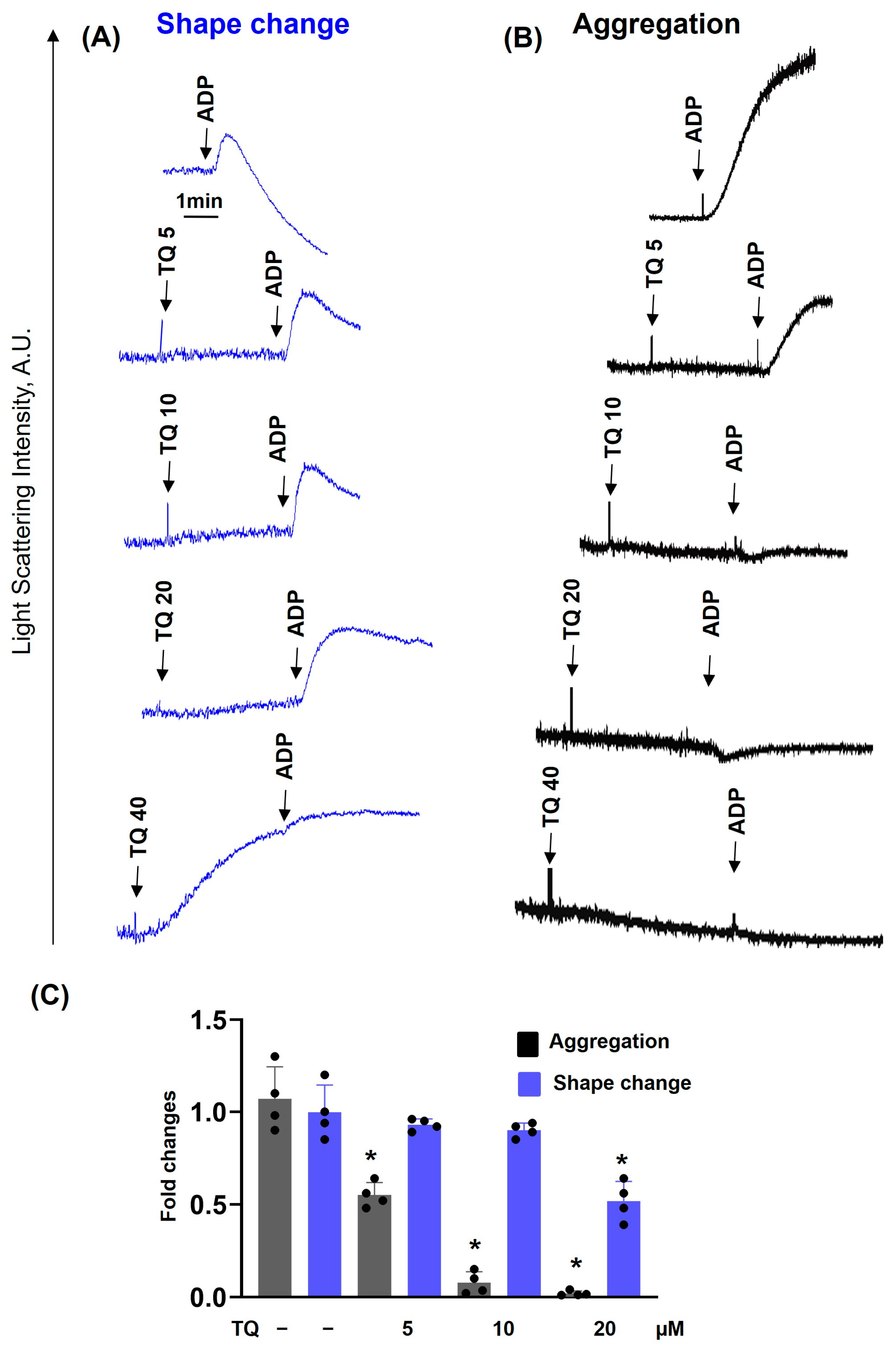 Figure 2. TQ concentration-dependently inhibits ADP-induced platelet aggregation. PRP from the same conditions as in Figure 1A–D was analyzed for aggregation (A) and shape change reaction (B) in LaSca-TM device. PRP was stimulated with ADP (1 µM) or preincubated with the indicated concentrations of TQ. Shown are original traces from four independent experiments. (C) are the summary data from four independent experiments (four different blood donors). Data (means ± SD, n = 4, *—significant differences from ADP-alone samples, p < 0.05) are presented as fold changes where ADP effect was taken as 1.