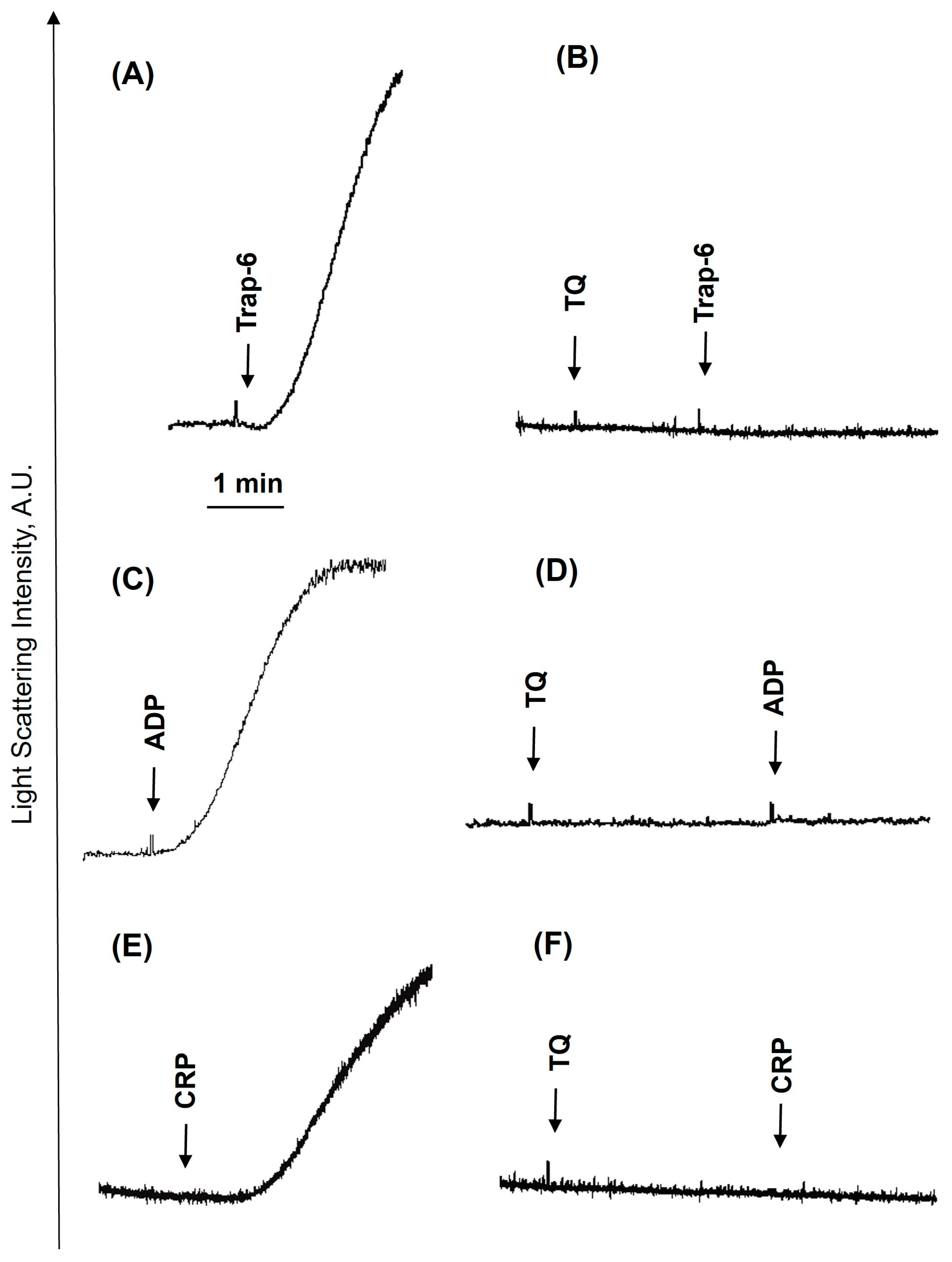 Figure 3. TQ completely inhibits agonist-induced platelet aggregation. PRP from the same conditions as in Figure 1A–D was analyzed for aggregation in LaSca-TM device. Shown are original traces from four independent experiments. PRP was stimulated by 10 µM Trap-6 (A), 1 µM ADP (C), 10 µg/mL CRP (E), or preincubated with TQ (40 µM, 3 min, B,D,F) and then stimulated with agonists.