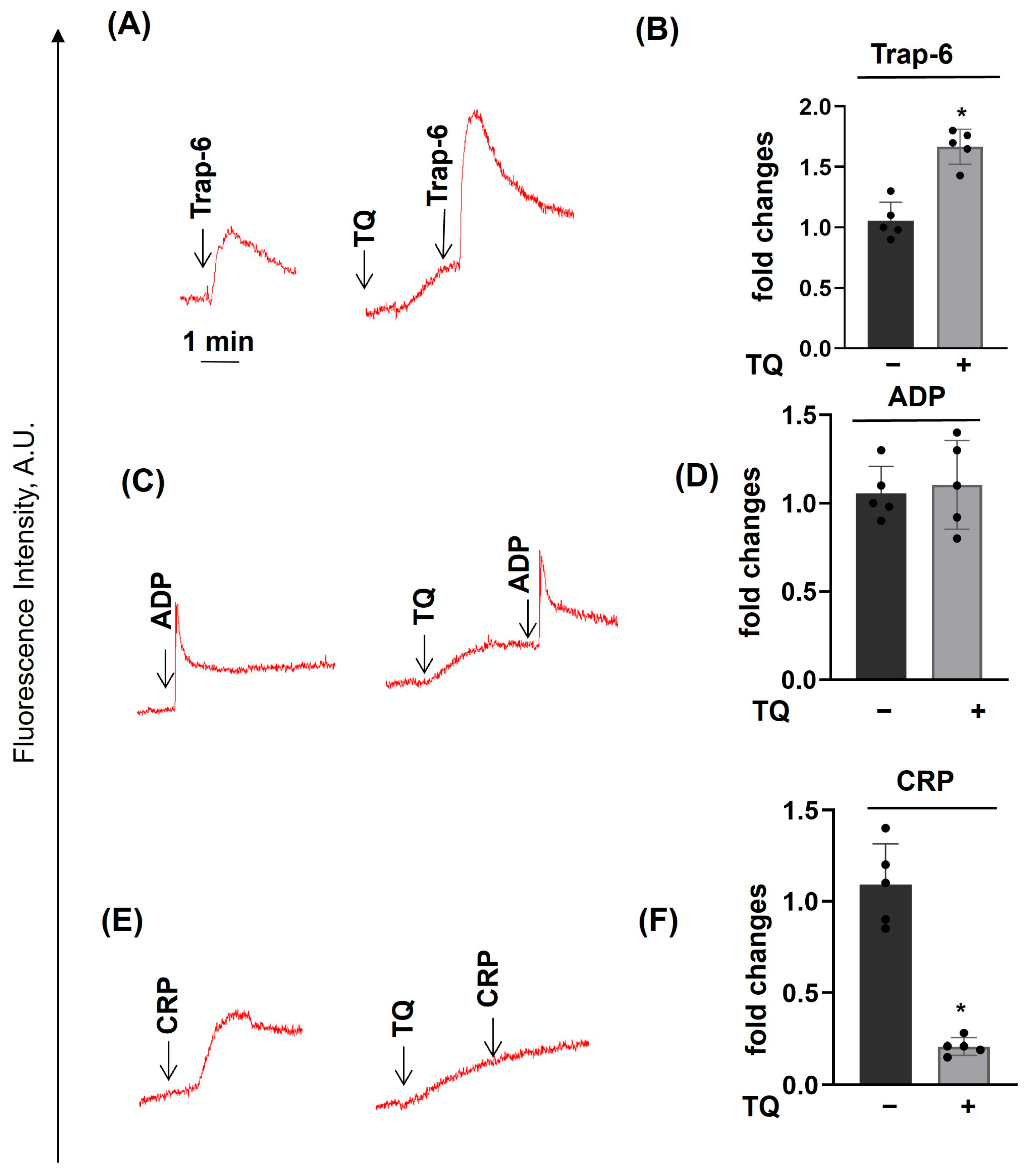 Figure 4. TQ differentially regulates agonist-induced intracellular Ca2+ mobilization. PRP was loaded with Fluo-3 AM (10 µM, 40 min), then diluted in HEPES buffer to maintain a platelet concentration of 2 × 107/mL and was stimulated with 10 µM Trap-6 (A,B), 1 µM ADP (C,D), 10 µg/mL CRP (E,F), or preincubated with TQ (40 µM, 3 min), and calcium mobilization was analyzed by LaSca-TMF device (for details, see Supplementary Figure S2C). FI at FL1, AU—fluorescence intensity at FL1 in arbitrary units. TQ significantly enhanced Trap-6-induced [Ca2+]i mobilization, had no effect on ADP-induced mobilization, and strongly inhibited CRP-induced platelet calcium mobilization. Left panels are original records; right panels are summary data from four independent experiments (four different blood donors). Data (means ± SD, n = 4, *—significant differences from samples without TQ, p < 0.05) are presented as fold changes where Trap-6 (A), ADP (C), and CRP (E) were taken as 1.