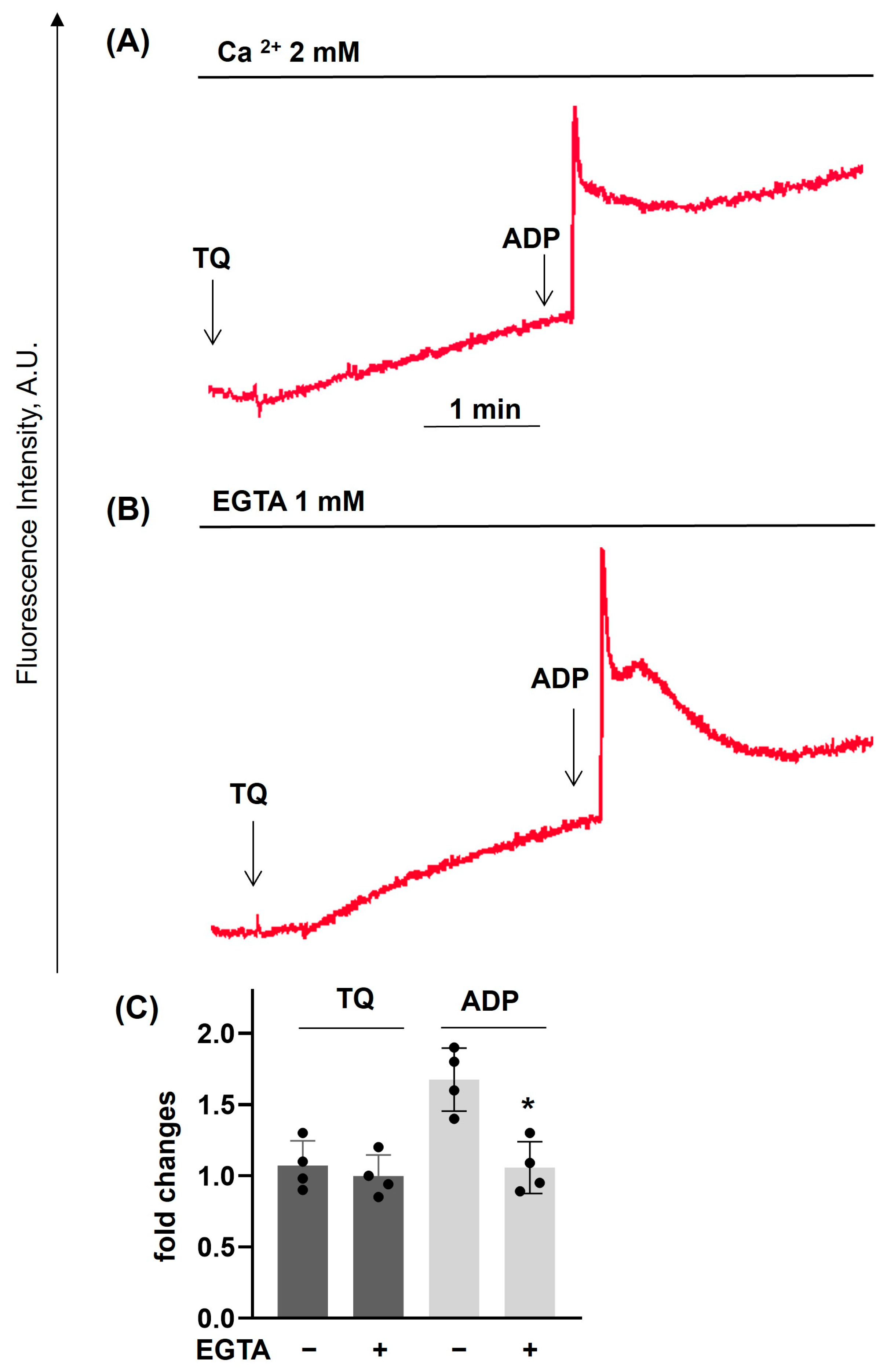 Figure 5. TQ-induced elevation of calcium mobilization is independent of extracellular calcium. PRP prepared as described in Figure 4 was analyzed for calcium mobilization using LaSca-TMF device. (A) In the presence of 2 mM calcium in the buffer, (B) In the buffer without calcium and 1 mM EGTA. PRP was incubated with TQ (40 µM, 3 min), then ADP (1 µM was added. (A,B) are the original traces from four independent experiments, (C) Is the summary data from these experiments. Data in (C) (means ± SD, n = 4, *—significant differences from samples in the buffer with calcium) are presented as fold changes where samples in the presence of calcium were taken as 1. TQ-induced elevation of intracellular calcium is not dependent on extracellular calcium, whereas ADP-induced mobilization is significantly reduced without extracellular calcium.