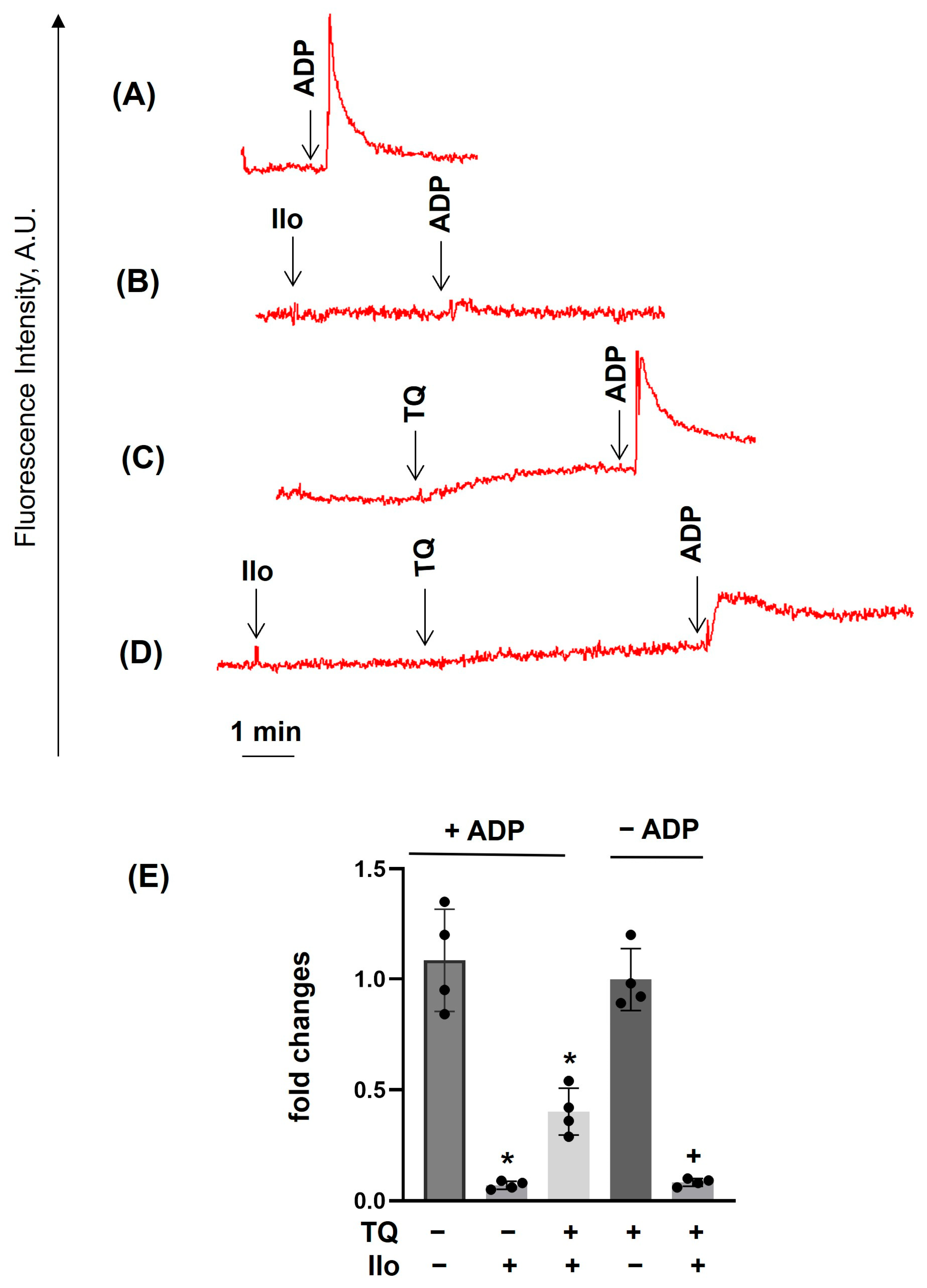 Figure 7. TQ partly reverses the iloprost-mediated inhibition of ADP-induced calcium mobilization. PRP prepared as described in Figure 4 was analyzed for calcium mobilization using the LaSca-TMF device. PRP was stimulated by 1 µM ADP (AD); (B) preincubated with iloprost (Ilo, 5 nM, 2 min); (C) preincubated with TQ (40 µM, 3 min); or in combination of Ilo + TQ, (D). (E) The summary data from these experiments. (AD) are original traces from four independent experiments. Data in (E) (means ± SD, n = 4, *—significant differences from ADP in +ADP samples; +—significant differences from TQ in −ADP samples, p < 0.05) are presented as fold changes in which +ADP, ADP is taken as 1, and in −ADP, TQ-induced elevation of intracellular calcium is taken as 1.