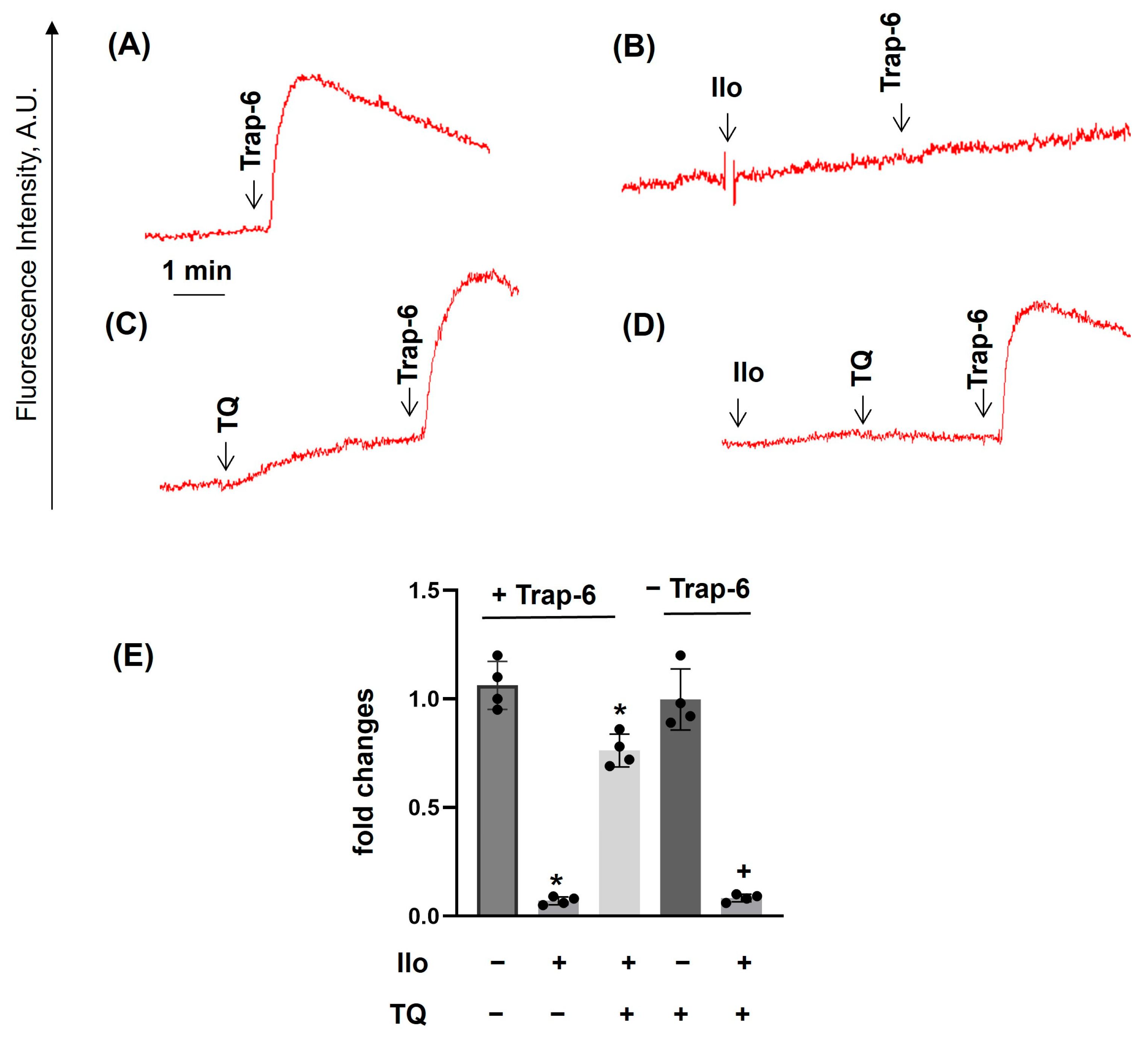 Figure 8. TQ strongly reverses iloprost-mediated inhibition of Trap-6-induced calcium mobilization. PRP prepared as described in Figure 4 was analyzed for calcium mobilization using the LaSca-TMF device. PRP was stimulated by 10 µM Trap-6 (AD); (B) preincubated with iloprost (Ilo, 5 nM, 2 min); (C) preincubated with TQ (40 µM, 3 min); or in combination of Ilo + TQ, (D). (AD) are original traces from four independent experiments. (E) The summary data from these experiments. Data in (E) (means ± SD, n = 4, *—significant differences from Trap-6 in +Trap-6 samples; +—significant differences from TQ in −Trap-6 samples, p < 0.05) are presented as fold changes in which +Trap-6, Trap-6 is taken as 1, and in −Trap-6, TQ-induced elevation of intracellular calcium is taken as 1.