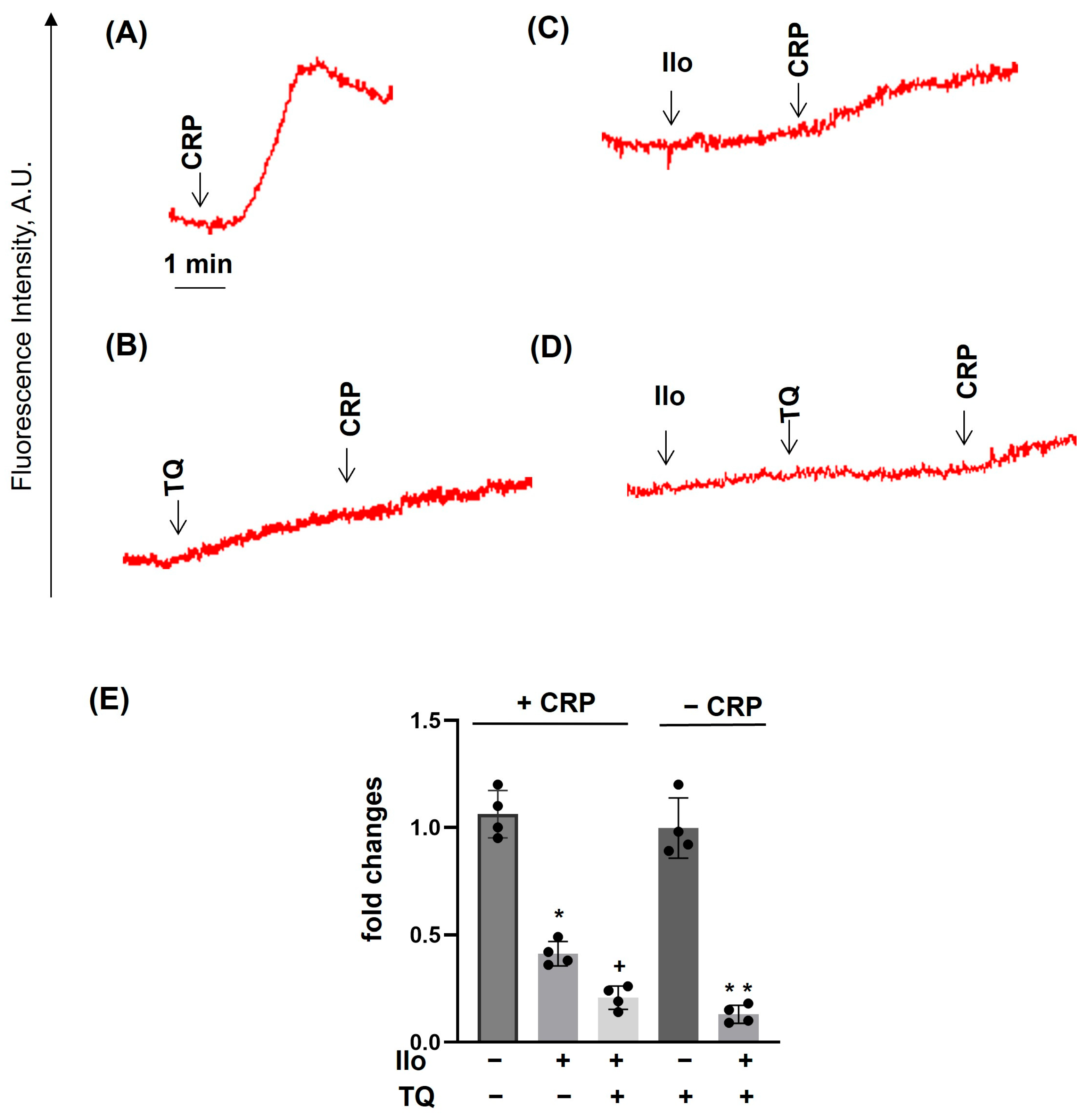 Figure 9. TQ did not reverse the iloprost-mediated inhibition of CRP-induced calcium mobilization. PRP prepared as described in Figure 4 was analyzed for calcium mobilization using the LaSca-TMF device. PRP was stimulated by 10 µg/mL of CRP (AD); (B), preincubated with iloprost (Ilo, 5 nM, 2 min); (C), preincubated with TQ (40 µM, 3 min); or in combination of Ilo + TQ, (D). (AD) are original traces from four independent experiments. (E)—is the summary data from these experiments. Data in (E) (means ± SD, n = 4, * significant differences from CRP in +CRP samples; +—significant differences from TQ in −CRP samples, p < 0.05) are presented as fold changes, in which in +CRP, CRP is taken as 1, and in −CRP, TQ-induced elevation of intracellular calcium is taken as 1.