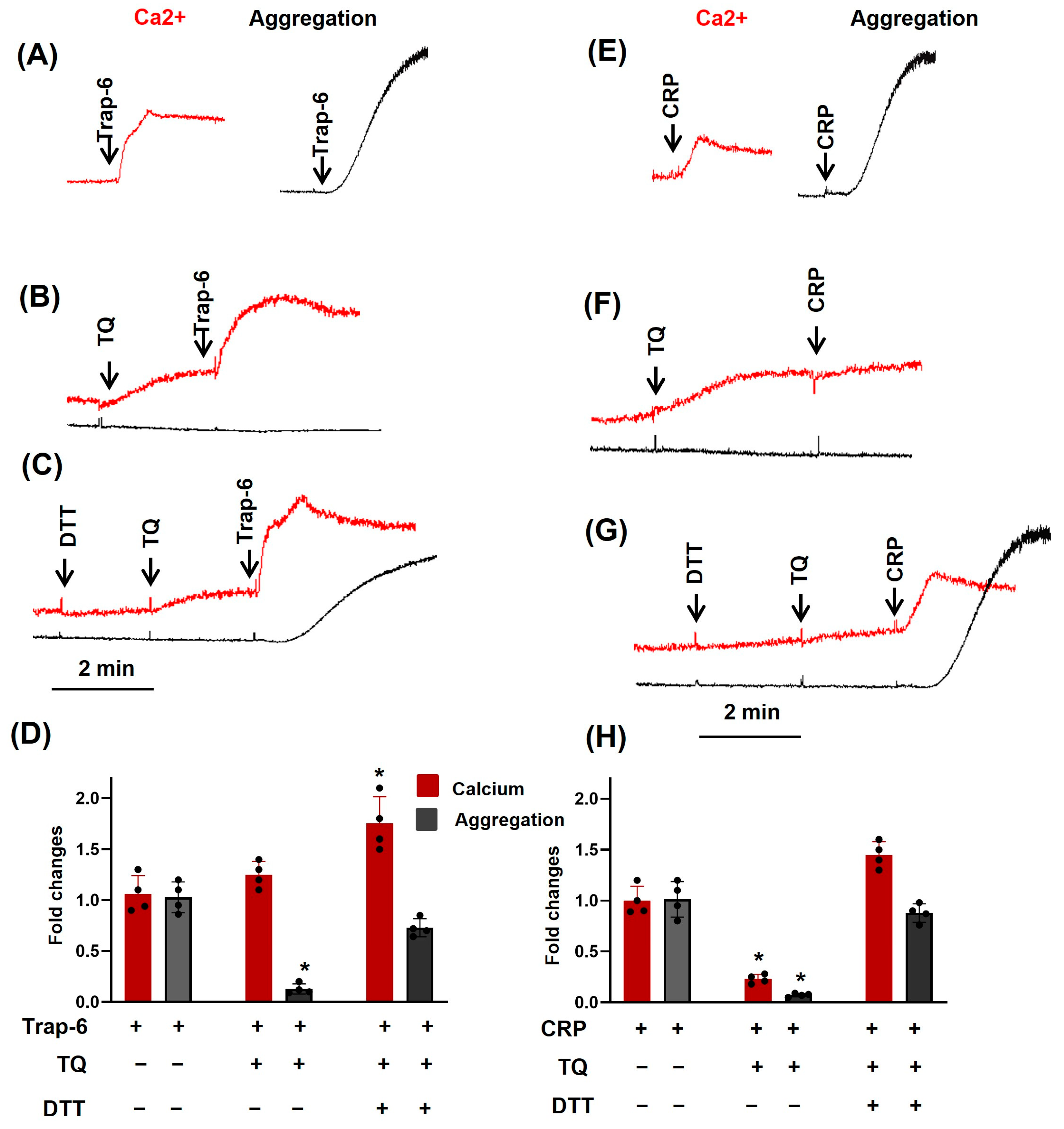 Figure 10. Dithiothreitol (DTT—a thiol-modifying agent) differentially regulates TQ-induced Trap-6 and CRP effects in platelets. PRP prepared as described in Figure 4 was analyzed for calcium mobilization (red) and aggregation (black) using the LaSca-TMF device. PRP was stimulated with 10 µM TRAP-6 (AD); preincubated with TQ (40 µM, 3 min) (B,D); or preincubated with 100 µM DTT, then with TQ (C,D). PRP was stimulated with 10 µg/mL CRP (EI); preincubated with TQ (40 µM, 3 min) (F,I); or preincubated with 100 µM DTT, then with TQ (G,I). Platelet aggregation and calcium mobilization were analyzed by the LaSca-TMF device. (AG) are original records. Data in (D) (means ± SD, n = 4) are summary results where Trap-6 is taken as 1, * significant differences from −/+ TQ. Data in (I) (means ± SD, n = 4) are summary results where CRP is taken as 1, * significant differences from −/+ TQ.